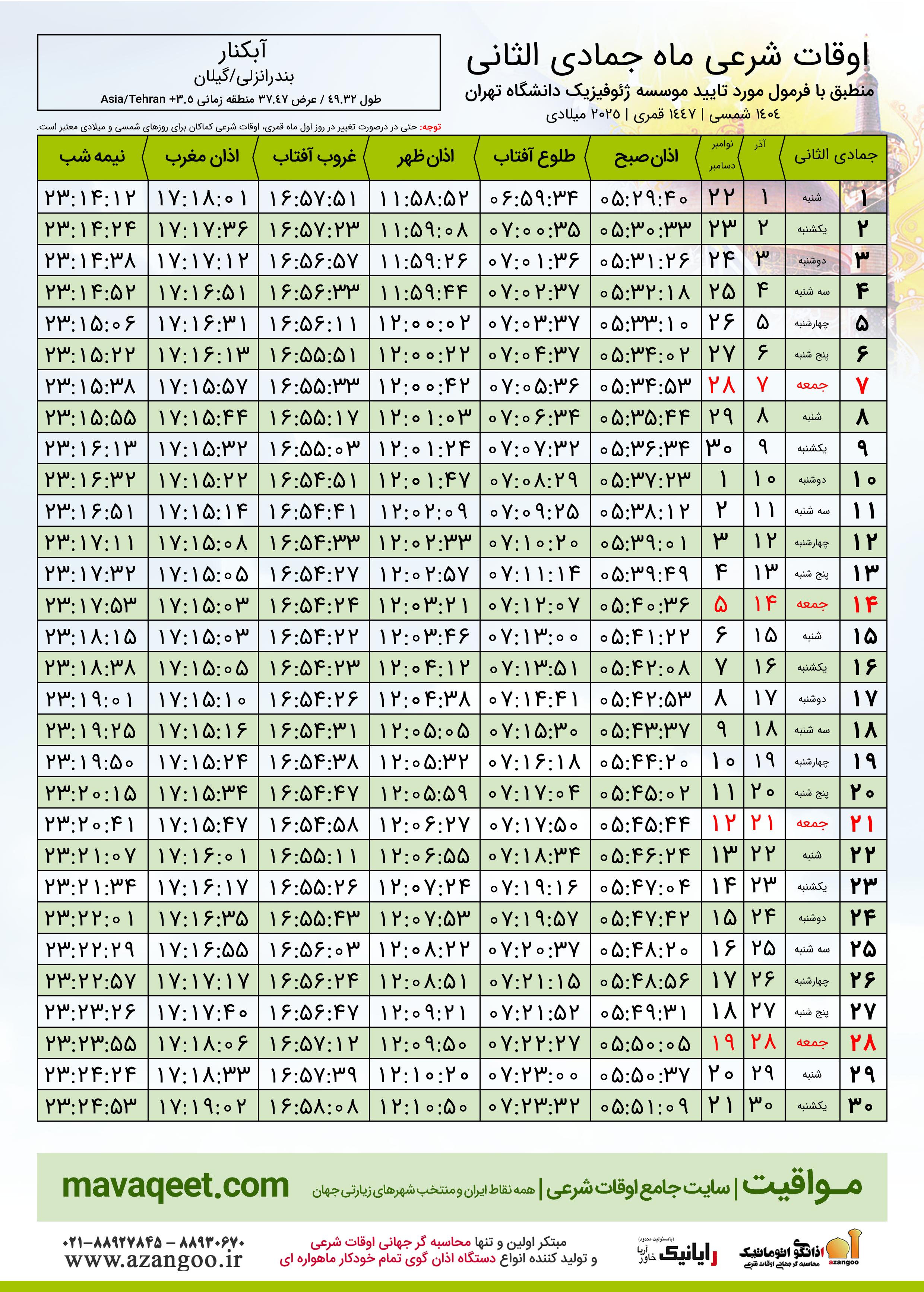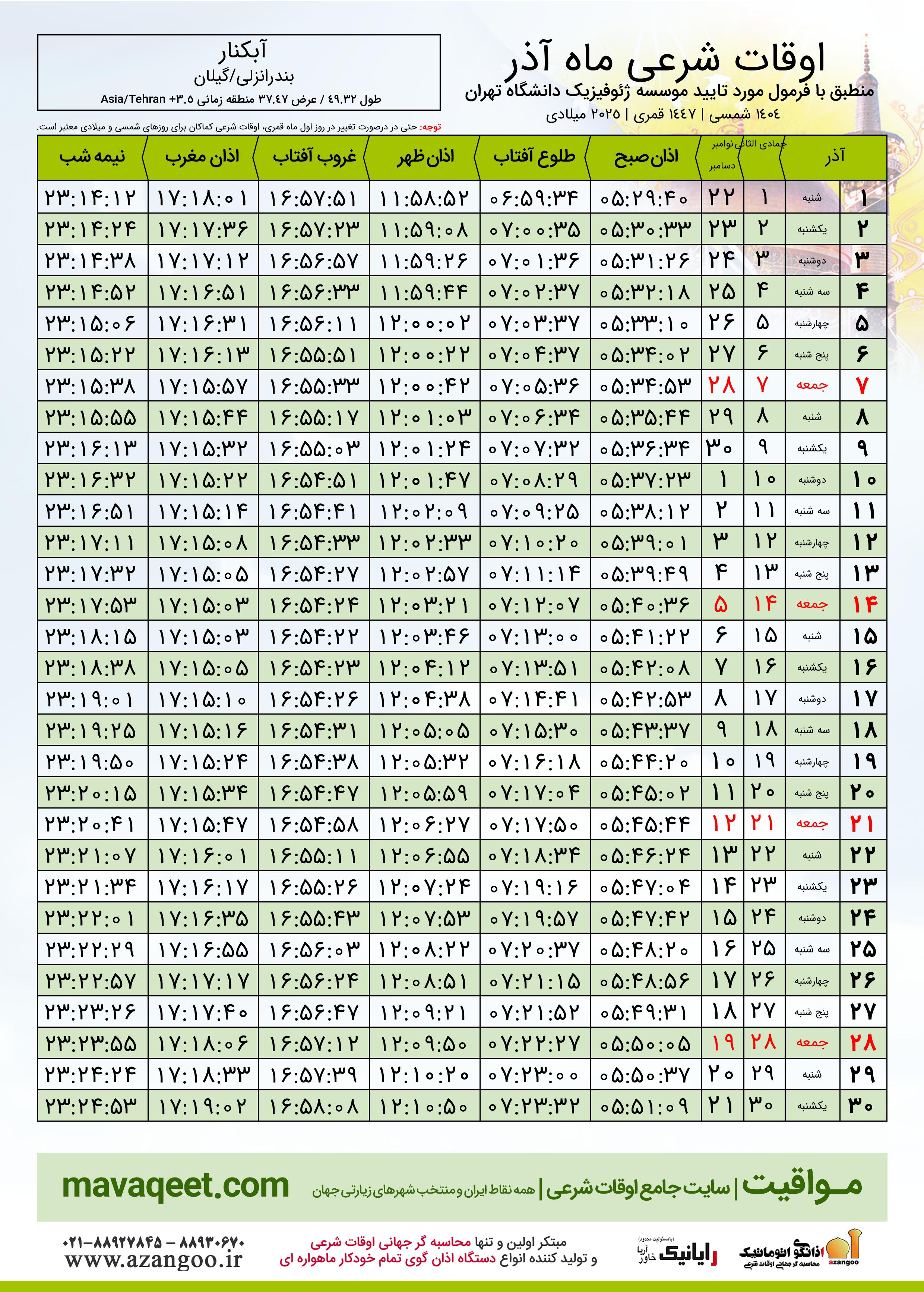 جدول اوقات شرعی دسامبر ٢٠٢٥ میلادی شهر آبکنار