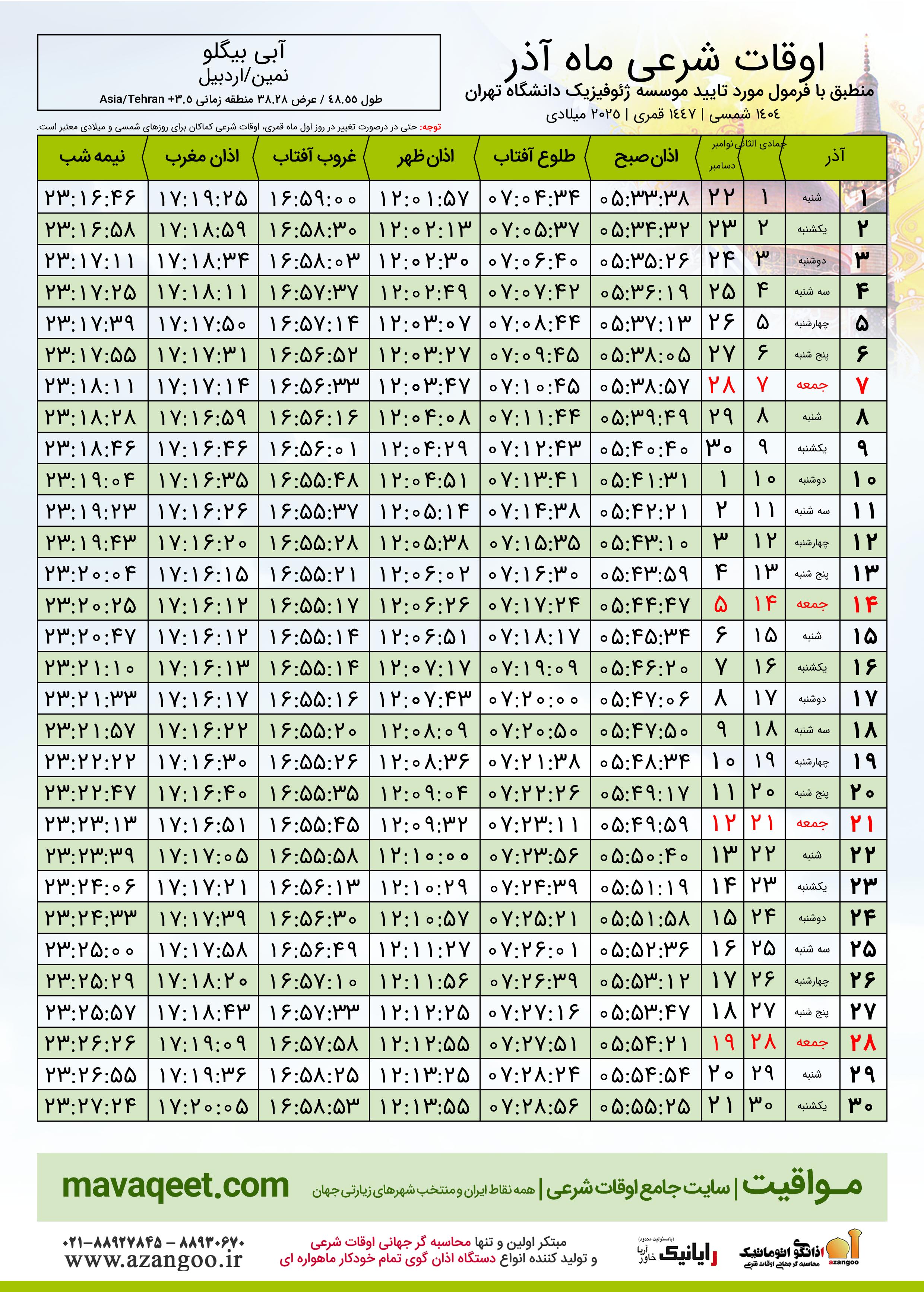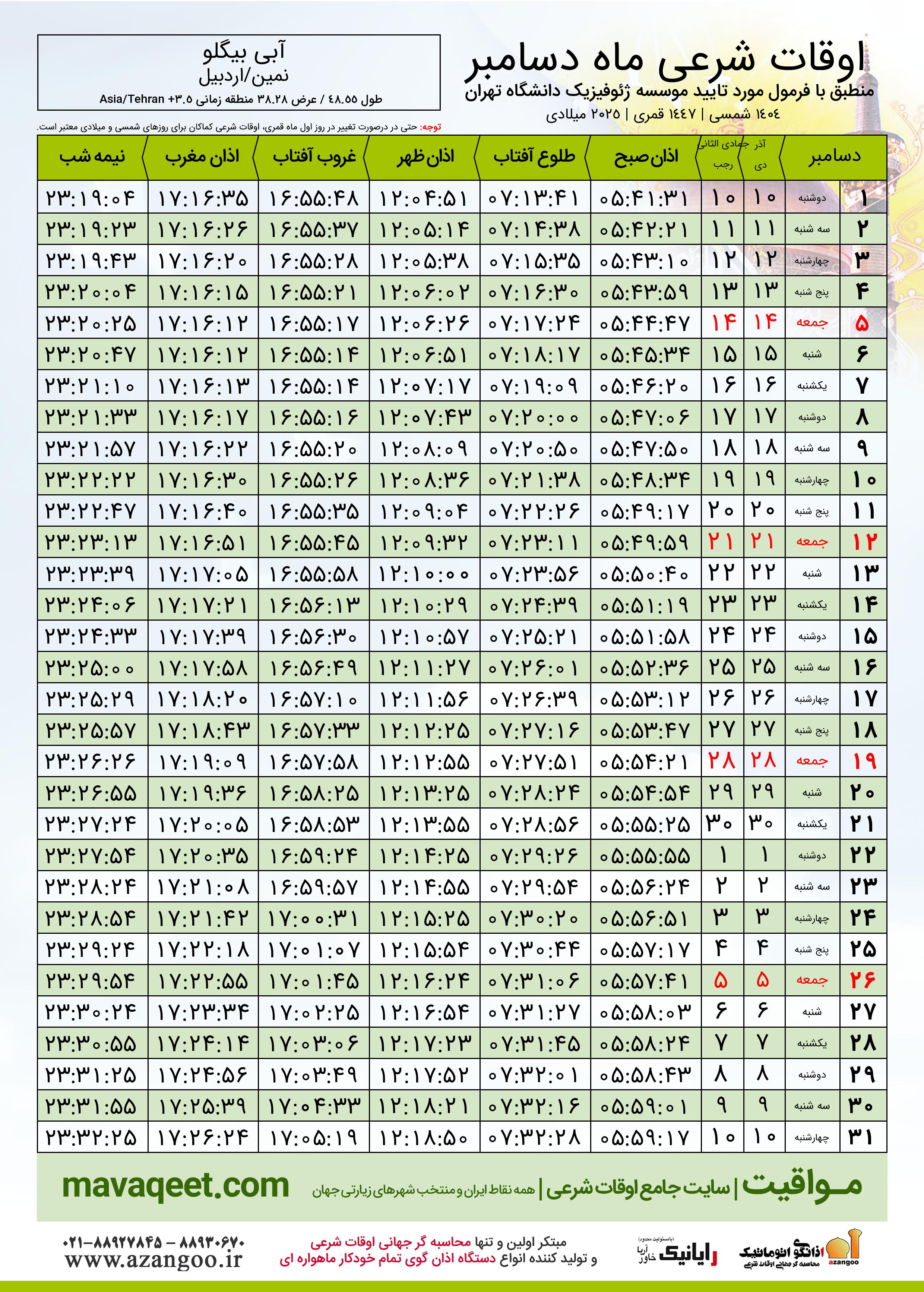 جدول اوقات شرعی دسامبر ٢٠٢٥ میلادی شهر آبی بیگلو