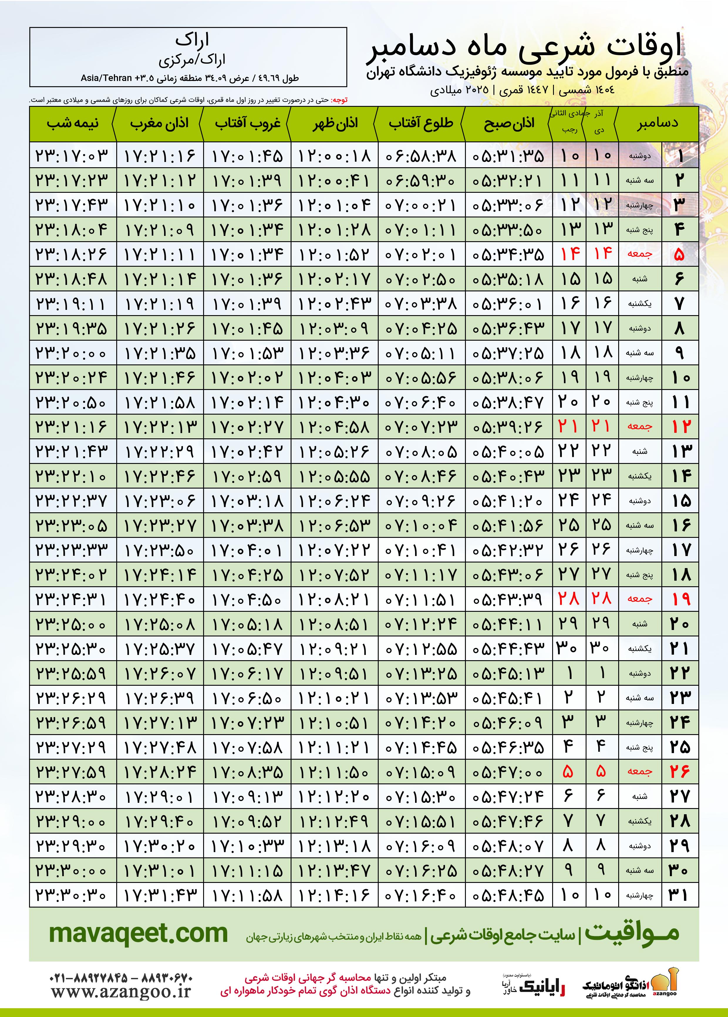 جدول اوقات شرعی دسامبر ٢٠٢٥ میلادی شهر اراک