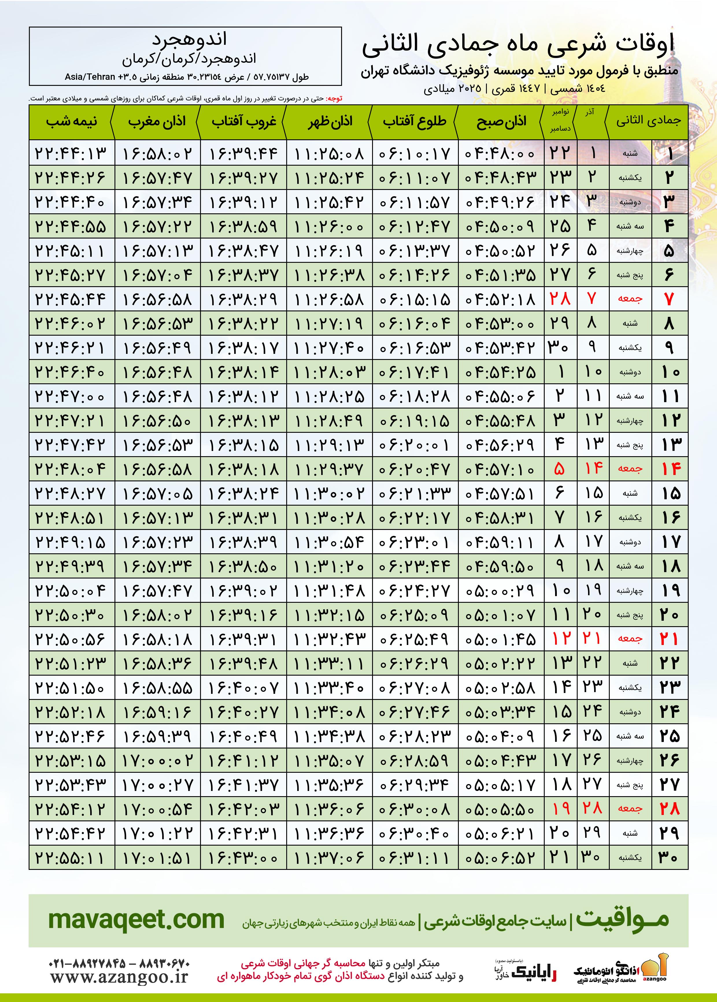 جدول اوقات شرعی جمادی الثانی ١٤٤٧ قمری روستای اندوهجرد