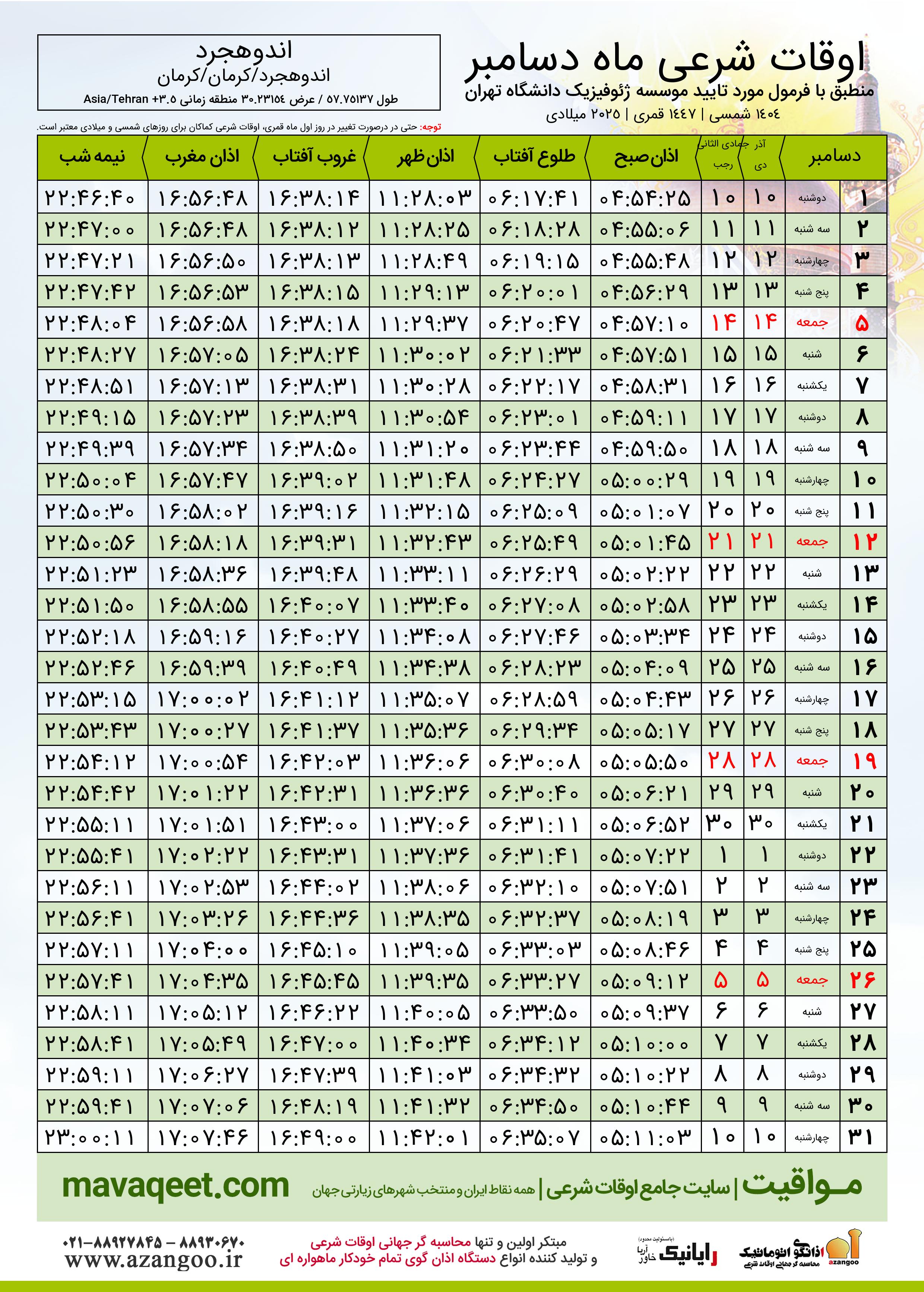جدول اوقات شرعی آذر ١٤٠٤ شمسی روستای اندوهجرد