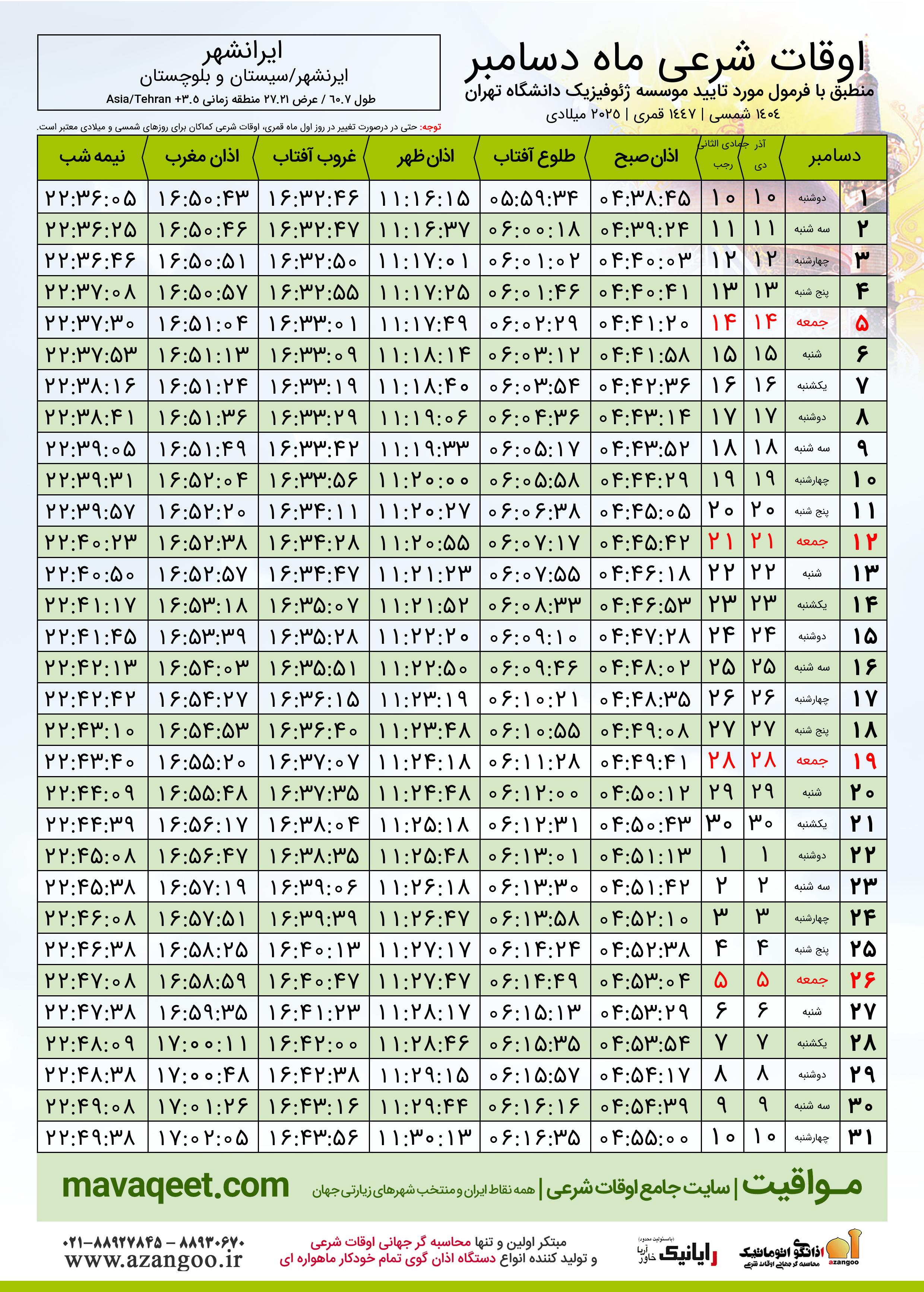 اوقات شرعی دسامبر ٢٠٢٥ میلادی شهر ایرانشهر