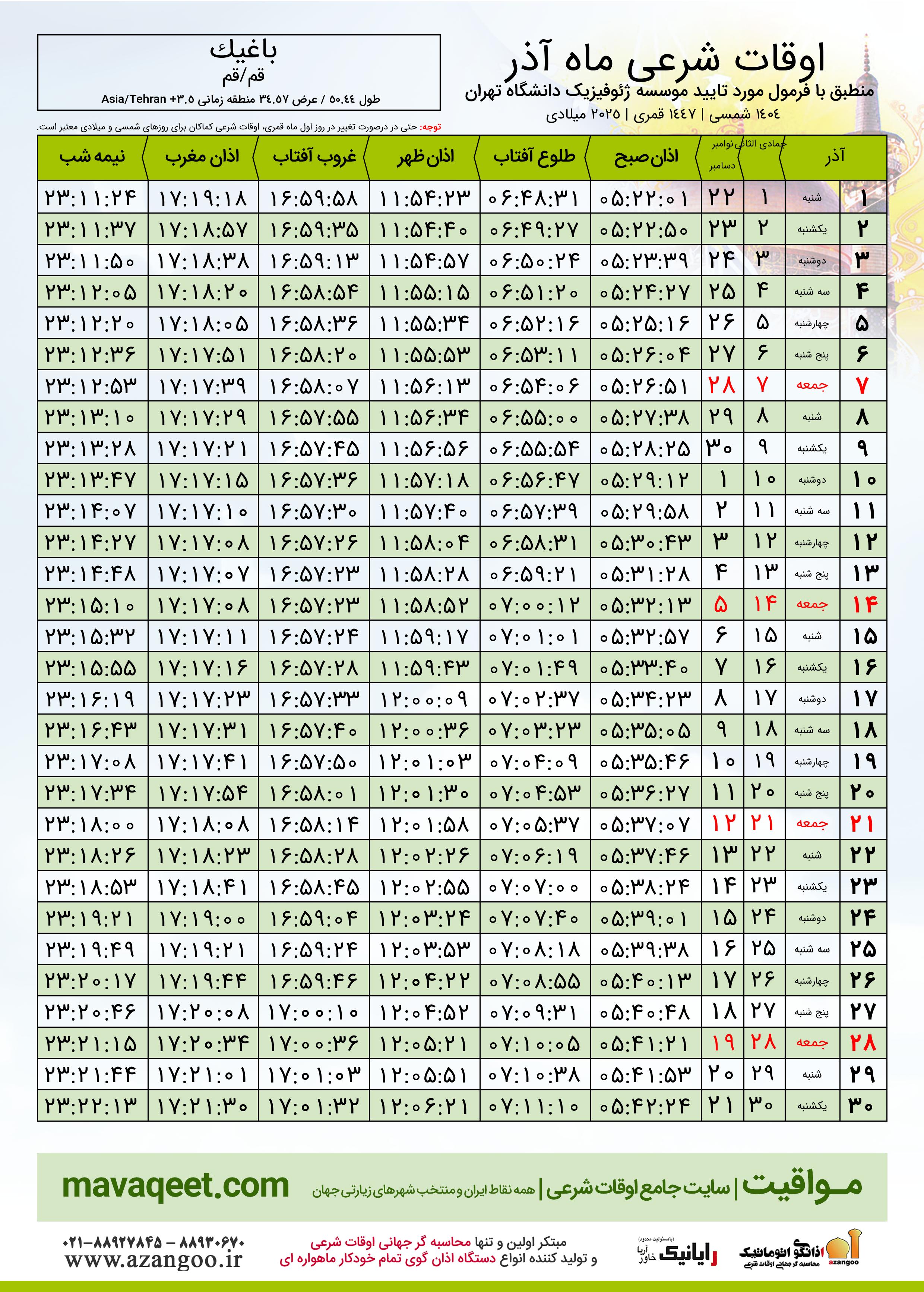 اوقات شرعی آذر ١٤٠٤ شمسی شهر باغیک