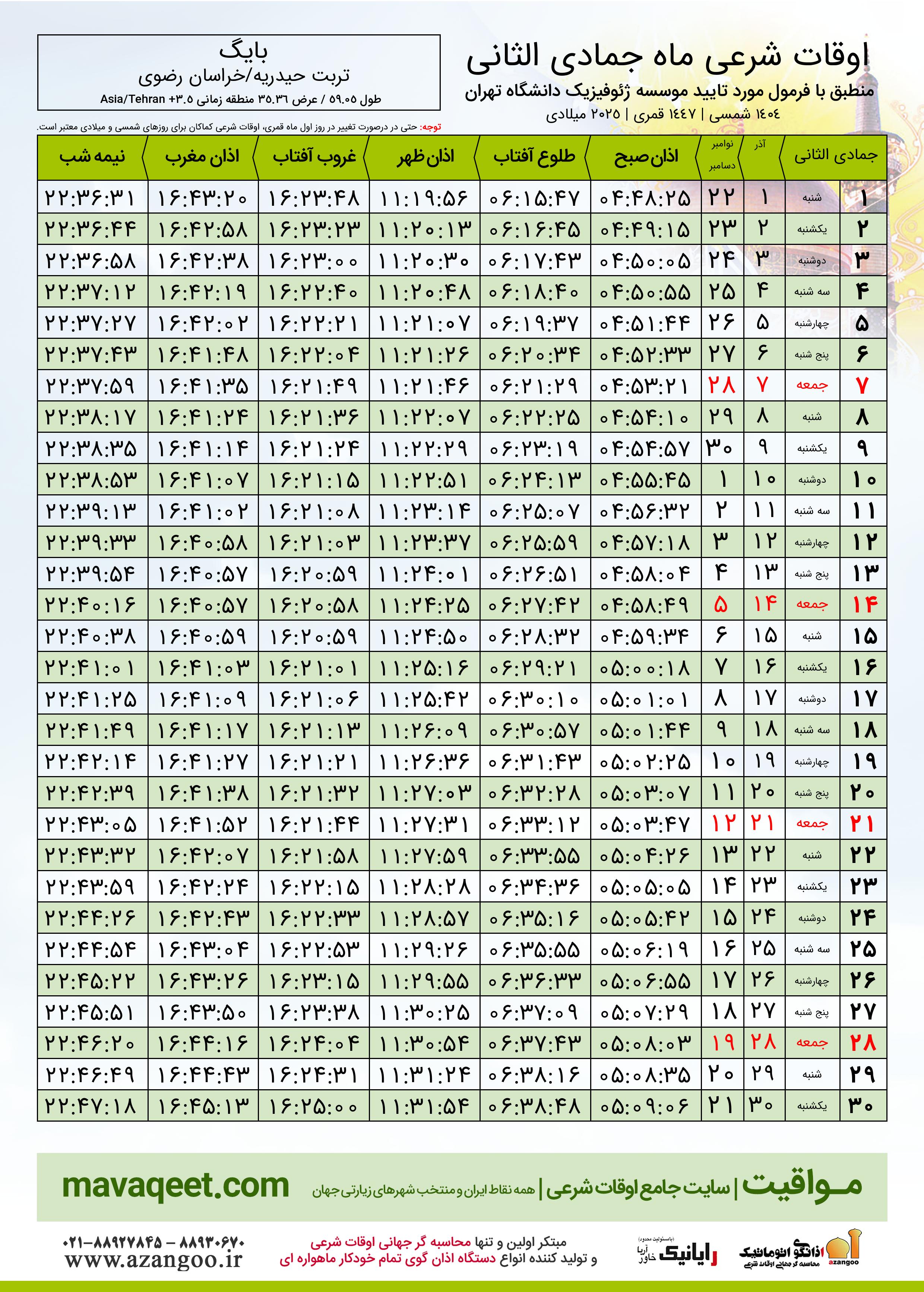 اوقات شرعی ماه رجب ١٤٤٧ هـ.ق شهر بایگ بر