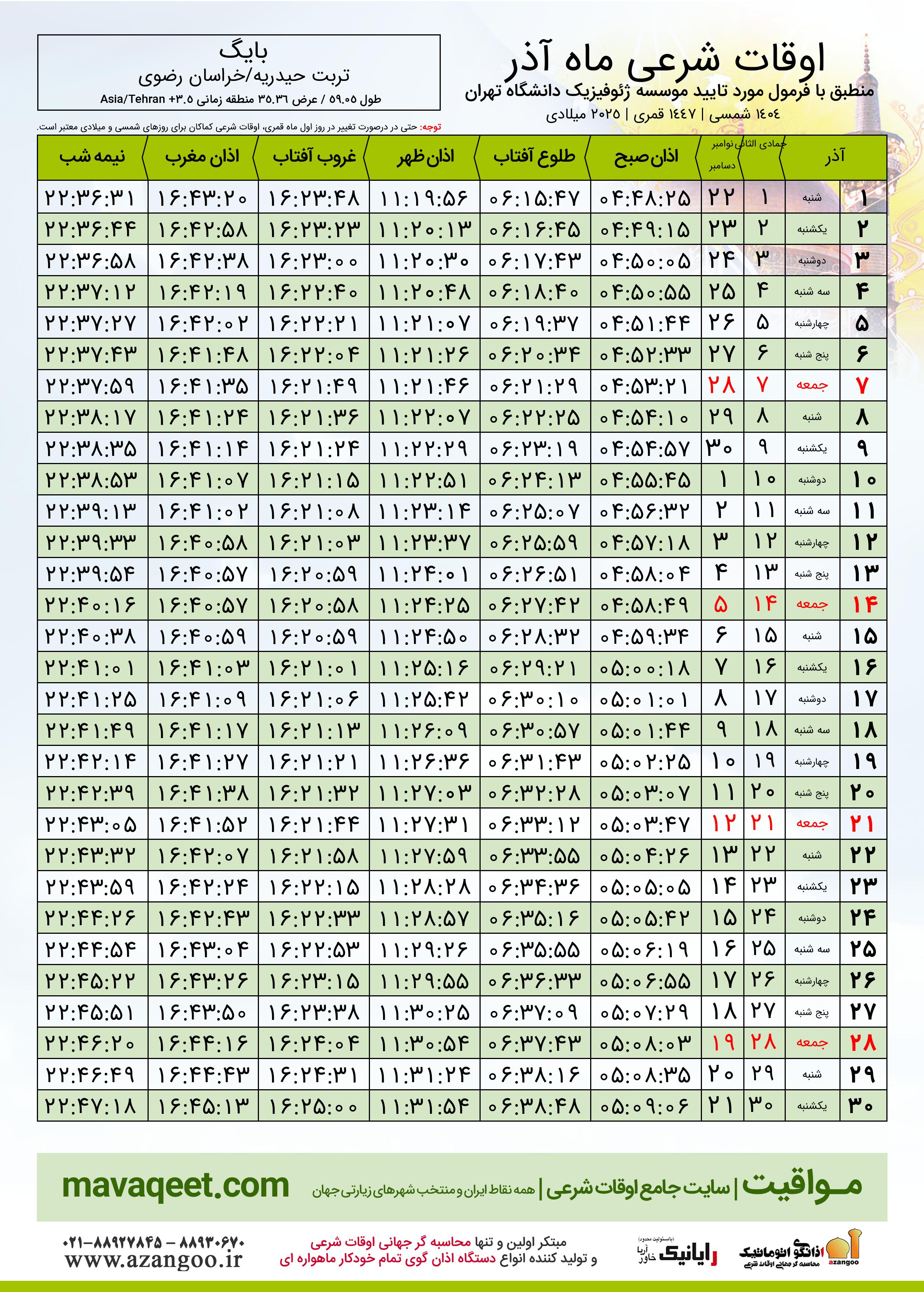 اوقات شرعی دسامبر ٢٠٢٥ میلادی شهر بایگ