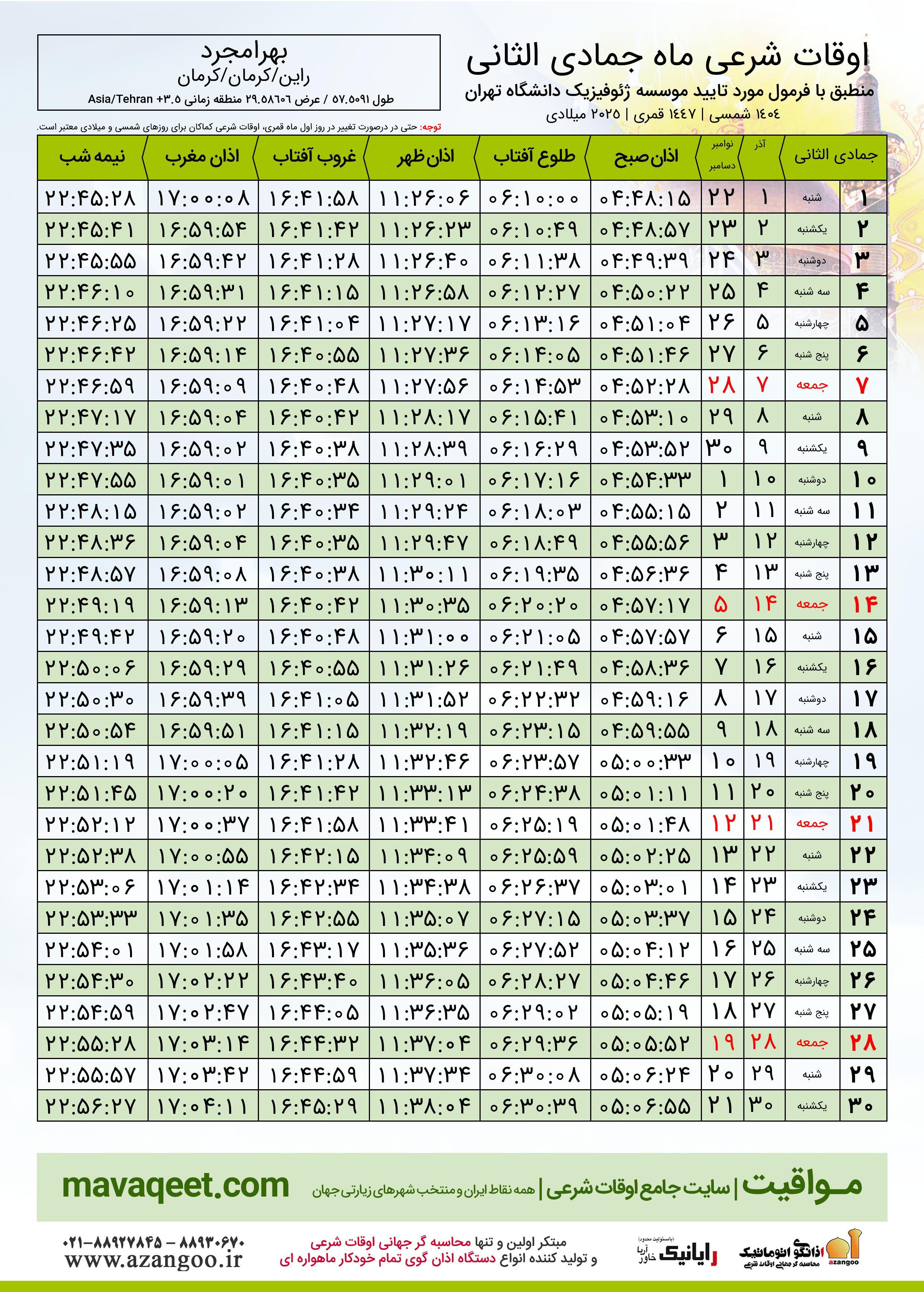 جدول اوقات شرعی جمادی الثانی ١٤٤٧ قمری روستای بهرامجرد