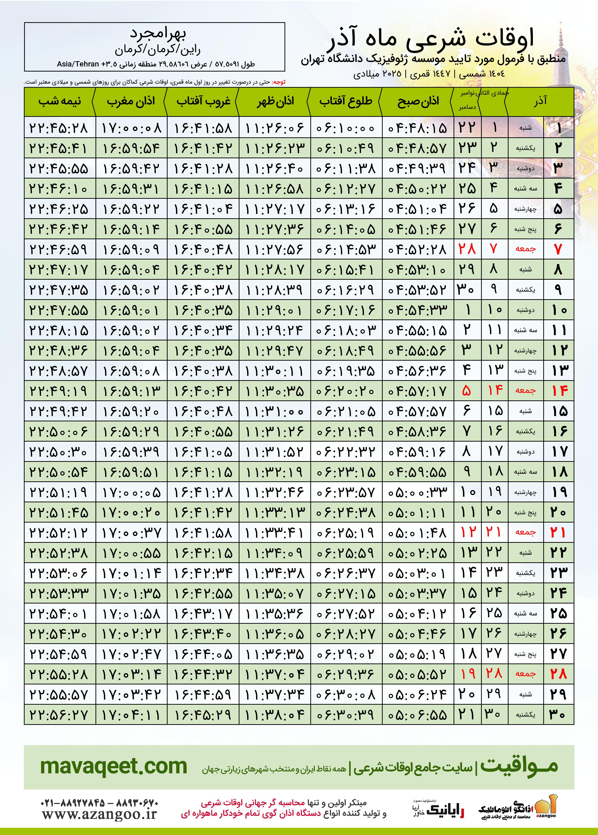 جدول اوقات شرعی آذر ١٤٠٤ شمسی روستای بهرامجرد