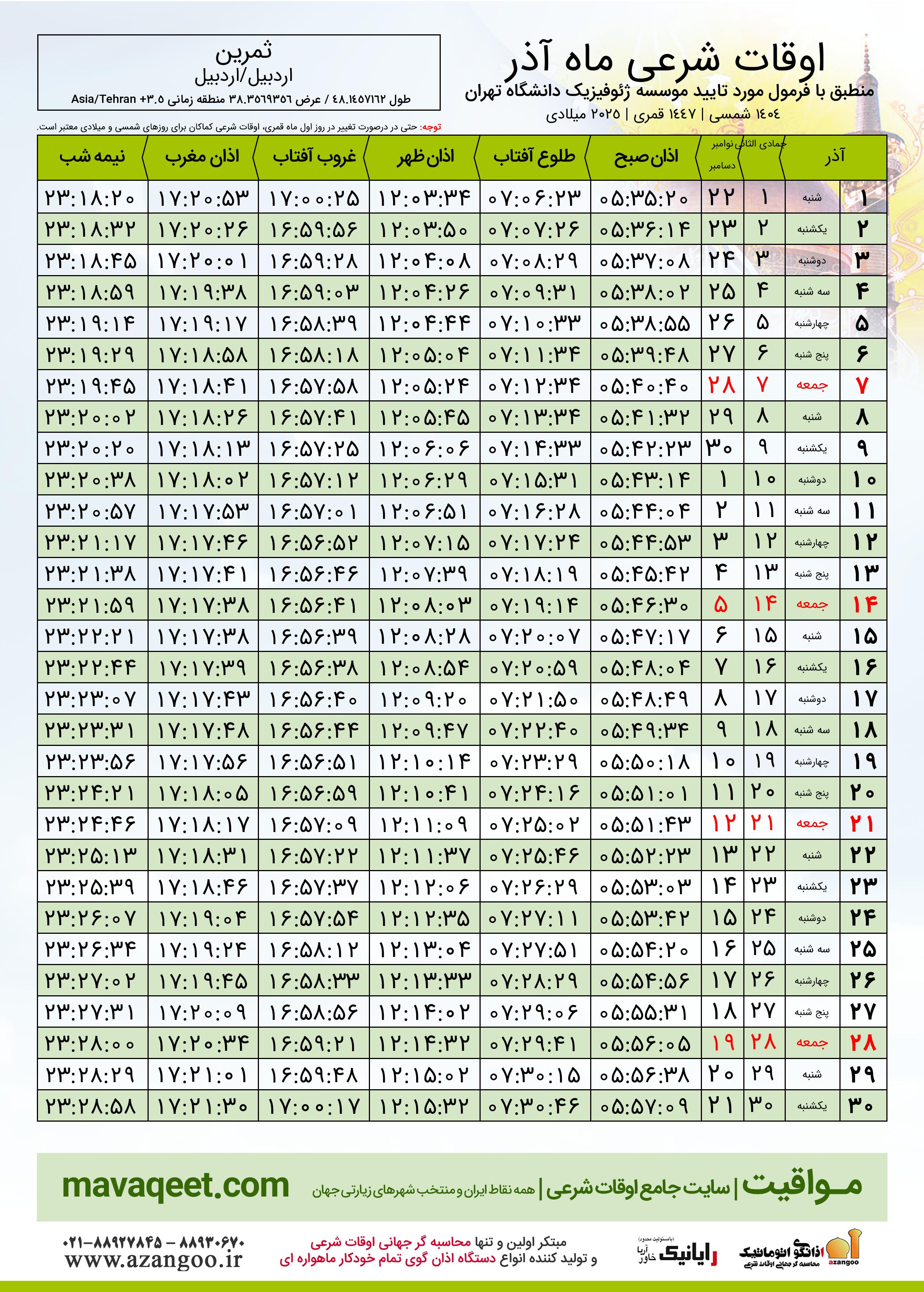 دانلود اوقات شرعی دسامبر ٢٠٢٥ شهر ثمرین