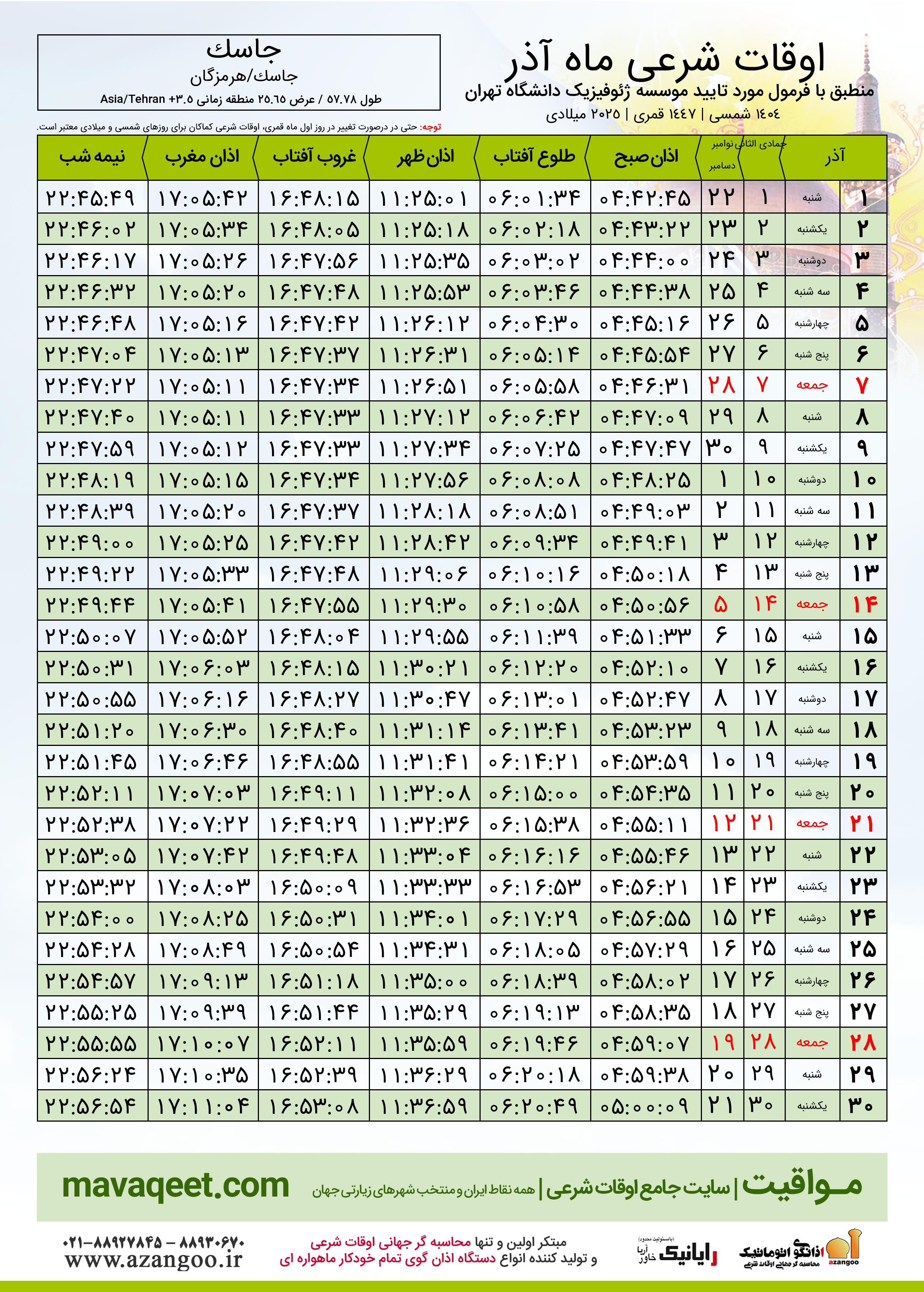 دانلود اوقات شرعی ماه رمضان ٠٤ - ١٤٠٤ شمسی | ٢٠٢٦ میلادی | ١٤٤٧ قمری شهر جاسک