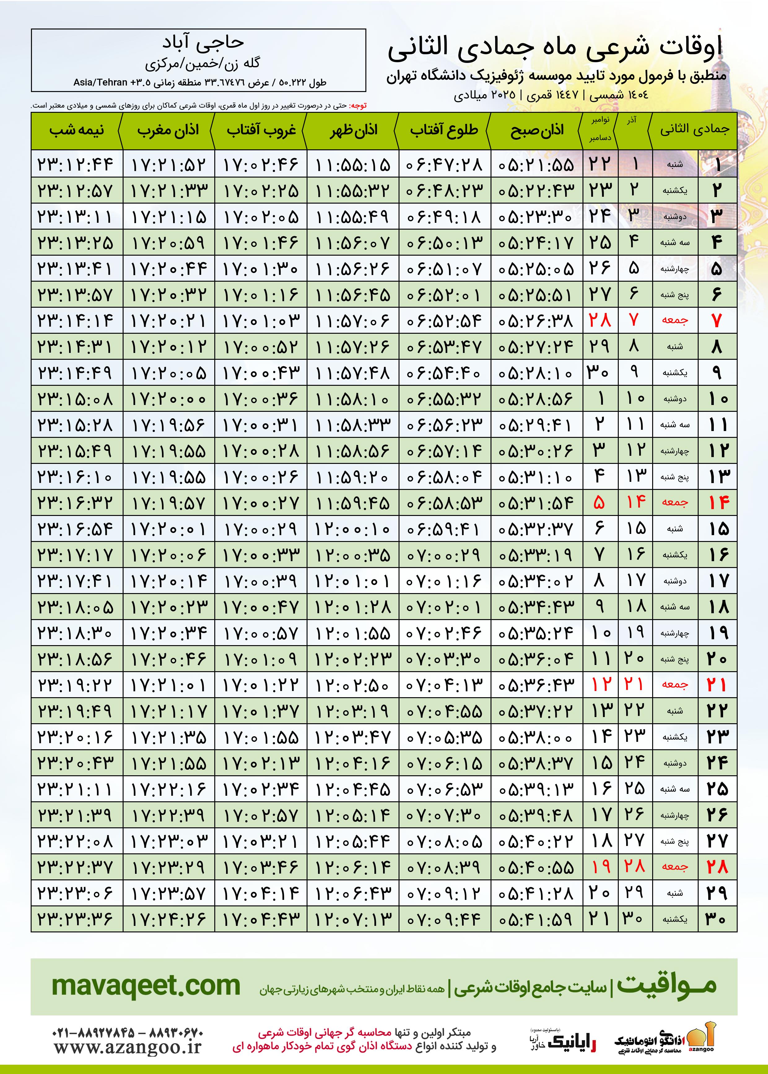 جدول اوقات شرعی جمادی الثانی ١٤٤٧ قمری روستای حاجی آباد