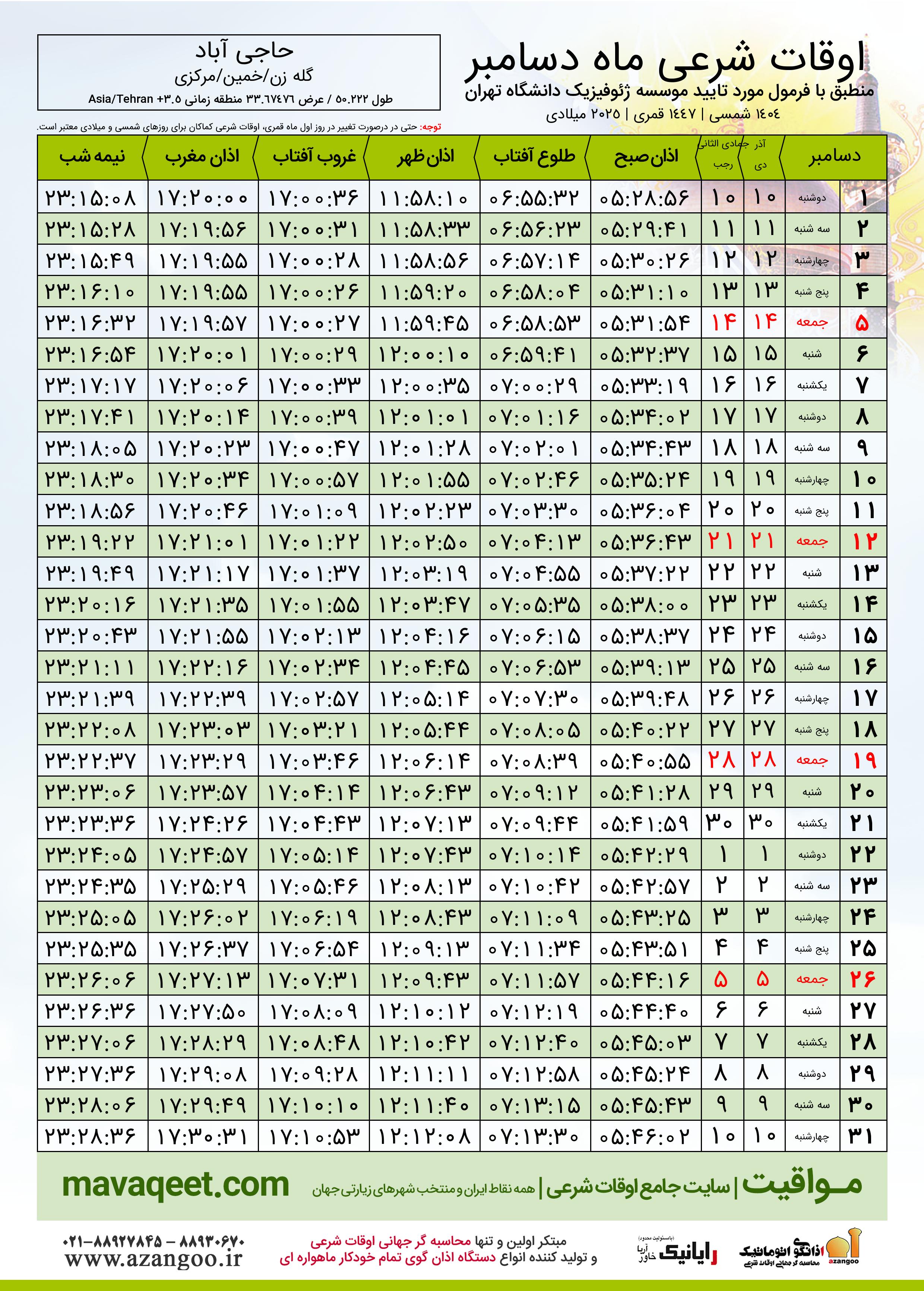 جدول اوقات شرعی دسامبر ٢٠٢٥ میلادی روستای حاجی آباد