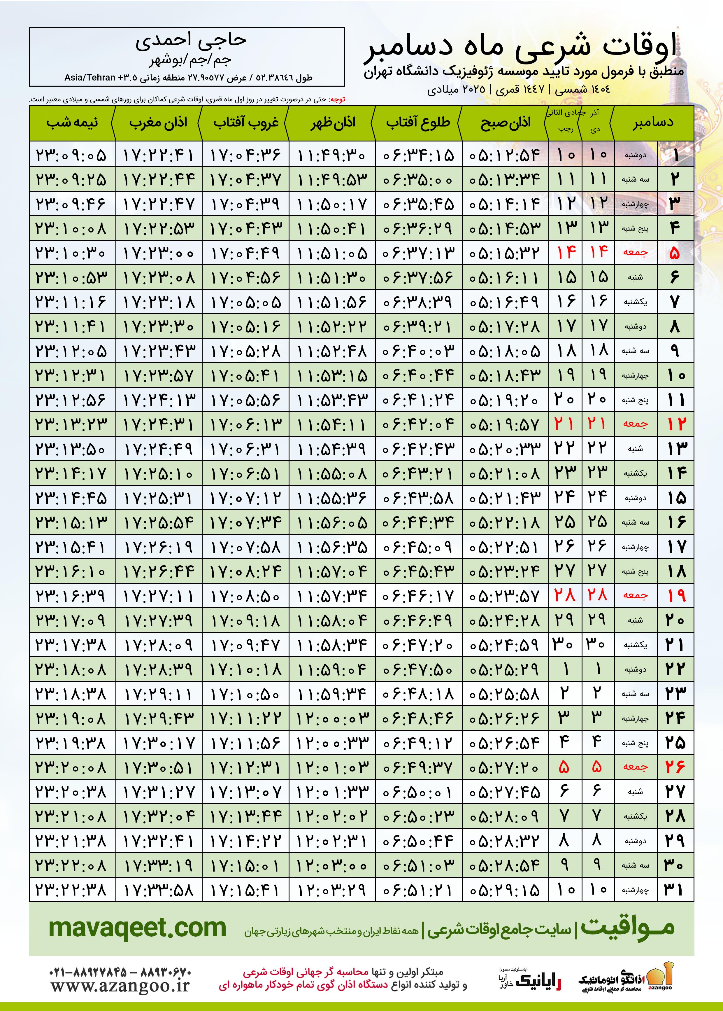 جهت نمایش تصویر جدول اوقات شرعی جدول اوقات شرعی دسامبر ٢٠٢٥ میلادی روستای حاجی احمدی روستای حاجی احمدی در اندازه
