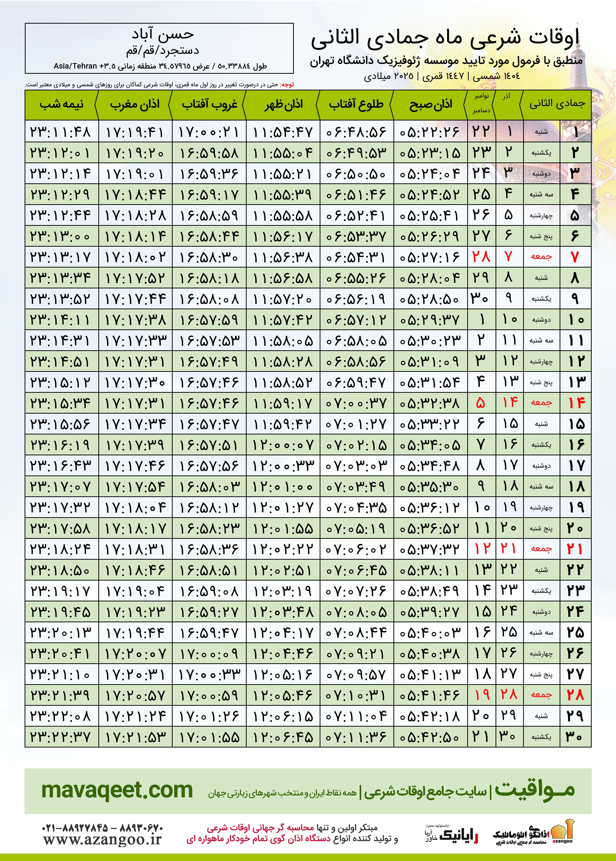 جدول اوقات شرعی جمادی الثانی ١٤٤٧ قمری روستای حسن آباد