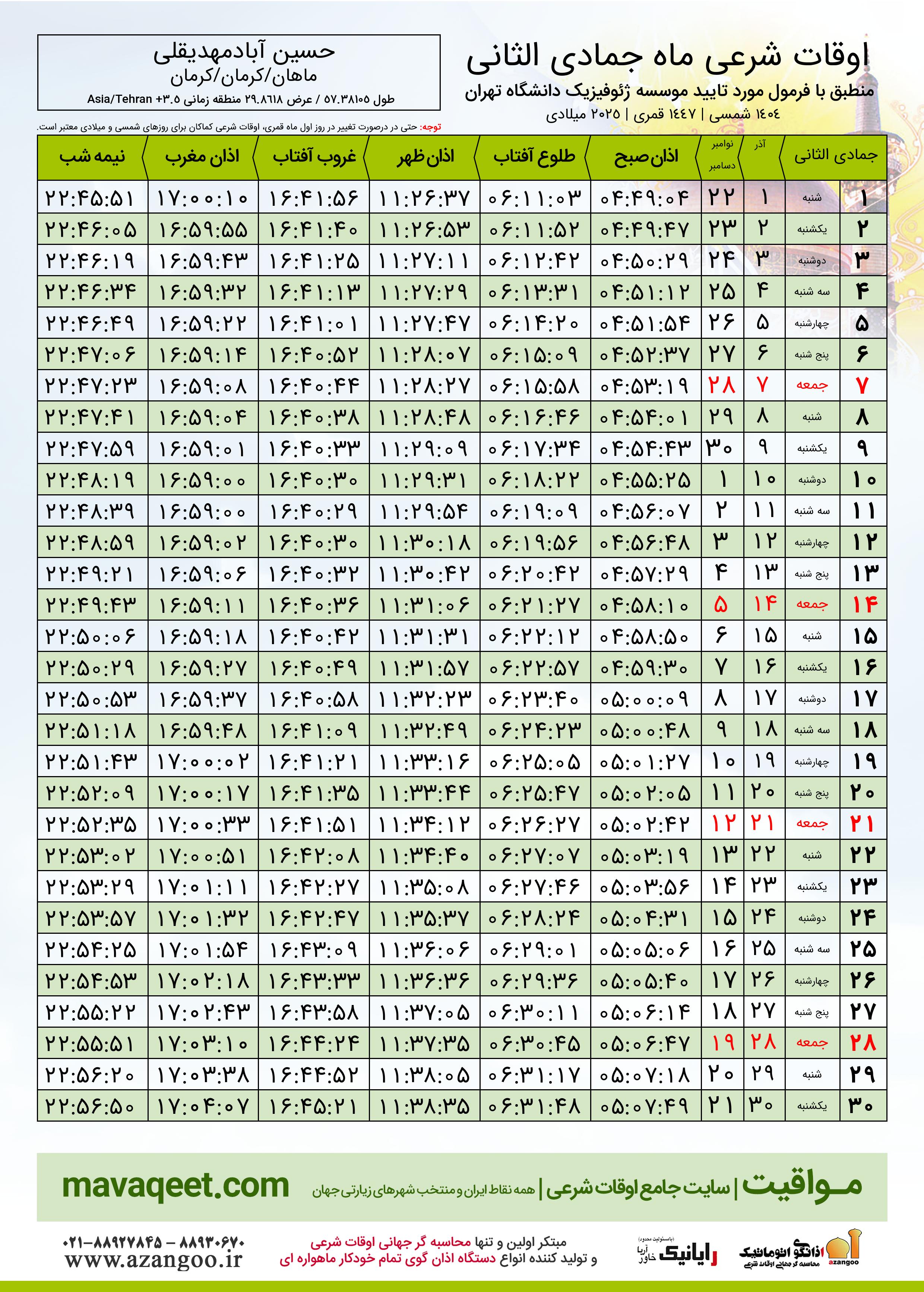 جدول اوقات شرعی جمادی الثانی ١٤٤٧ قمری روستای حسین آبادمهدیقلی