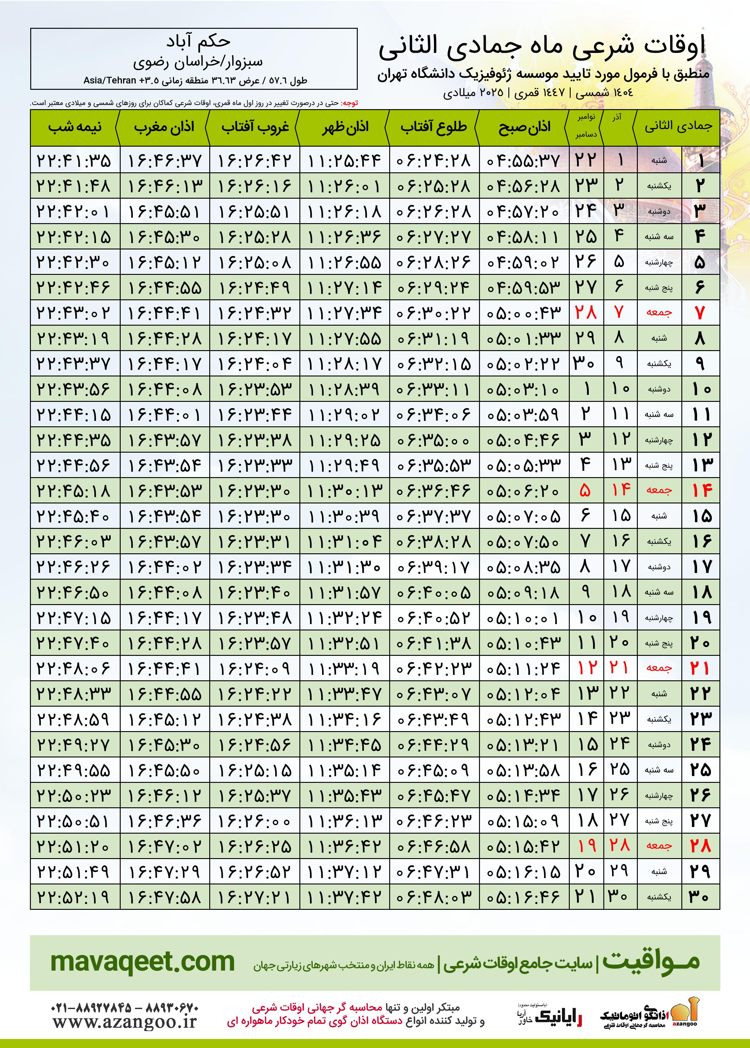 جدول اوقات شرعی جمادی الثانی ١٤٤٧ قمری شهر حکم آباد