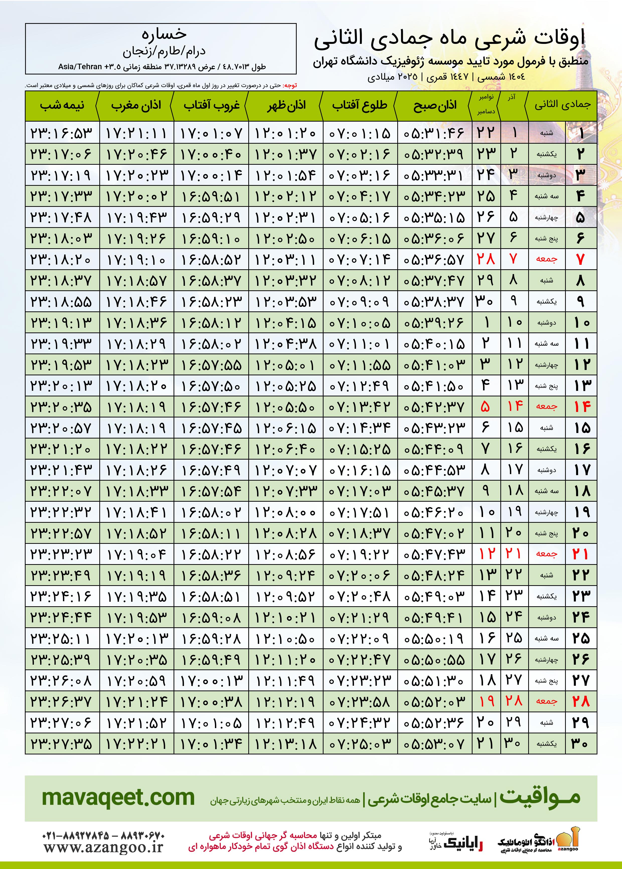 جدول اوقات شرعی جمادی الثانی ١٤٤٧ قمری روستای خساره