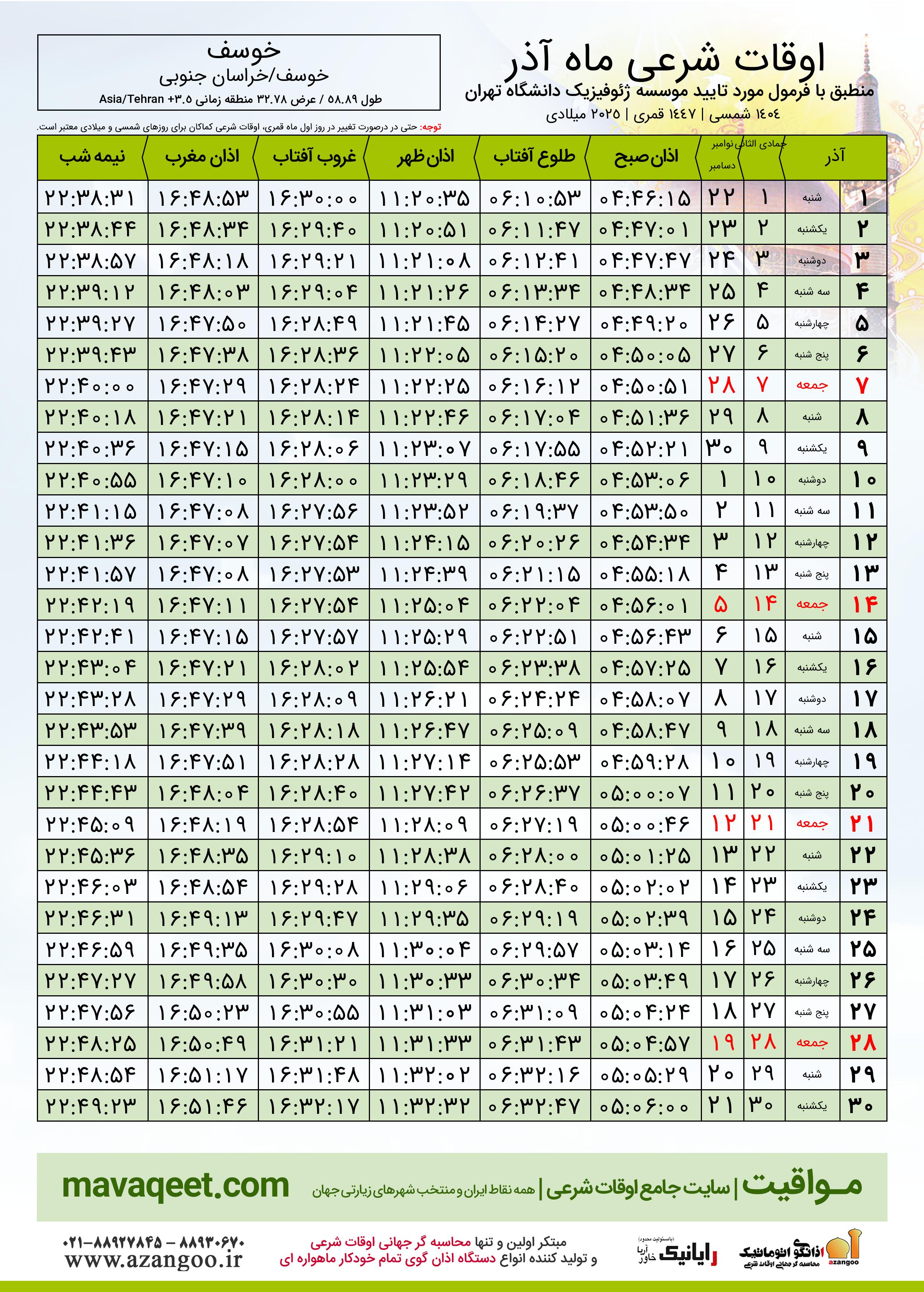 جدول اوقات شرعی دسامبر ٢٠٢٥ میلادی شهر خوسف