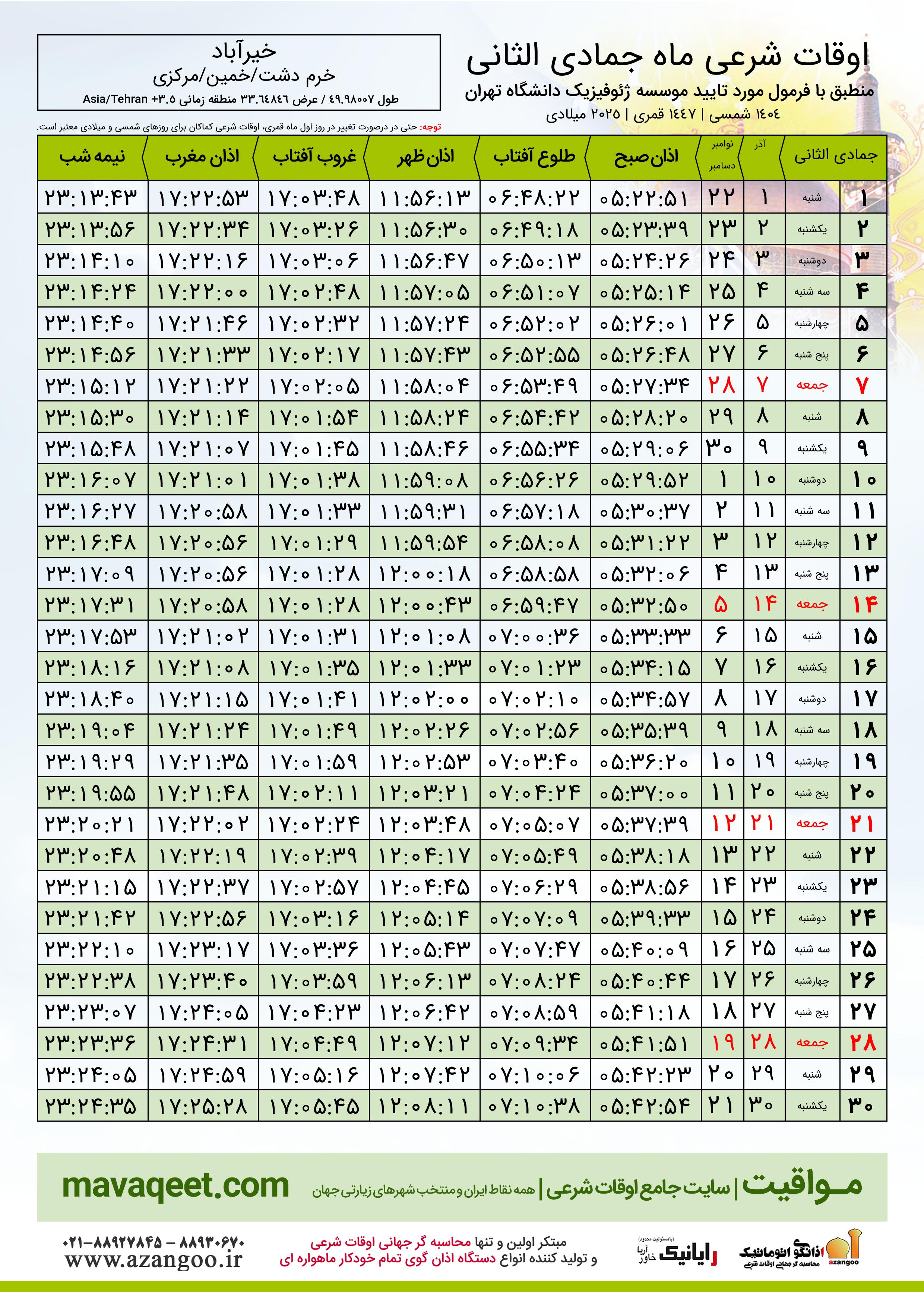 جدول اوقات شرعی جمادی الثانی ١٤٤٧ قمری روستای خیرآباد