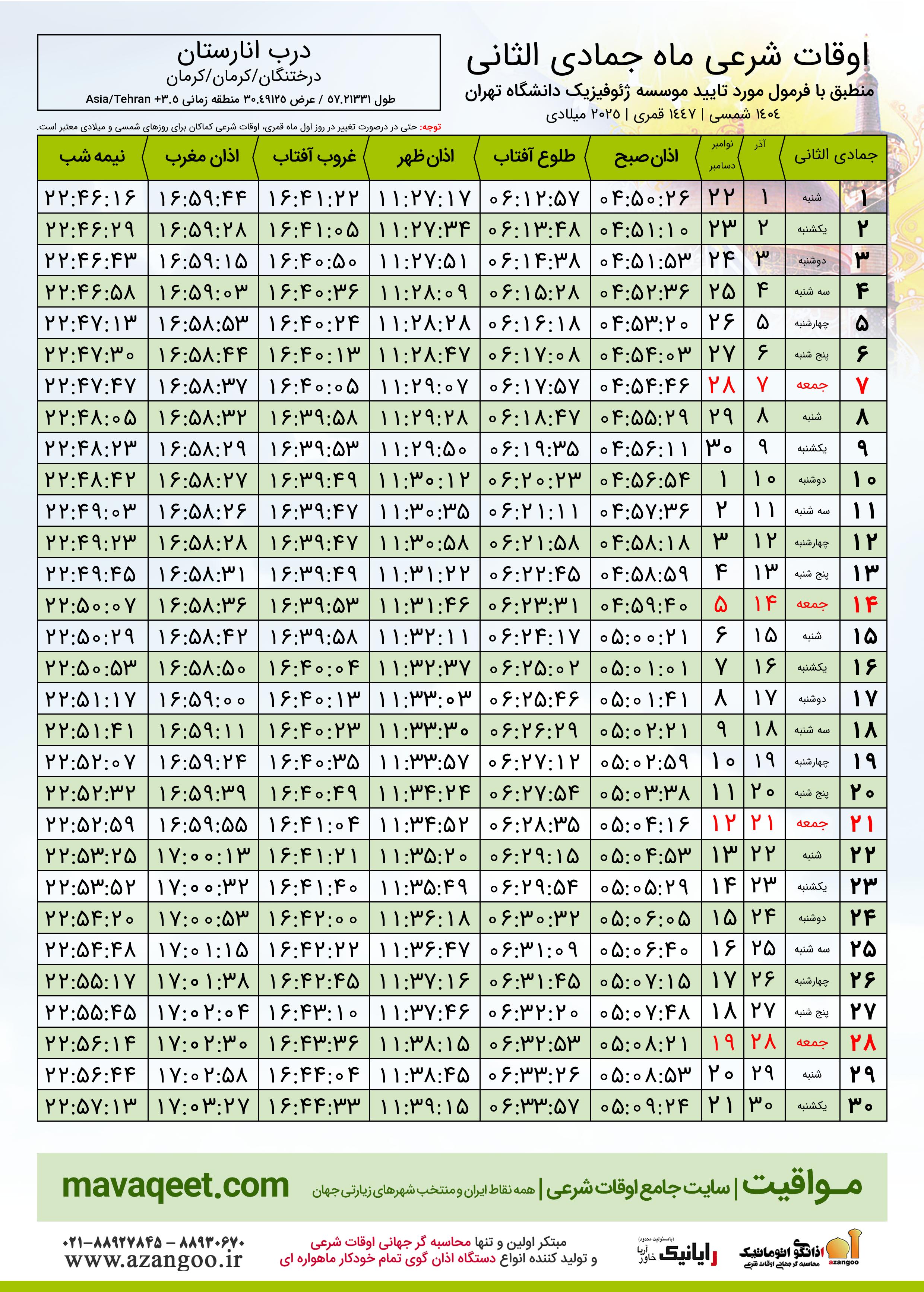 جدول اوقات شرعی جمادی الثانی ١٤٤٧ قمری روستای درب انارستان