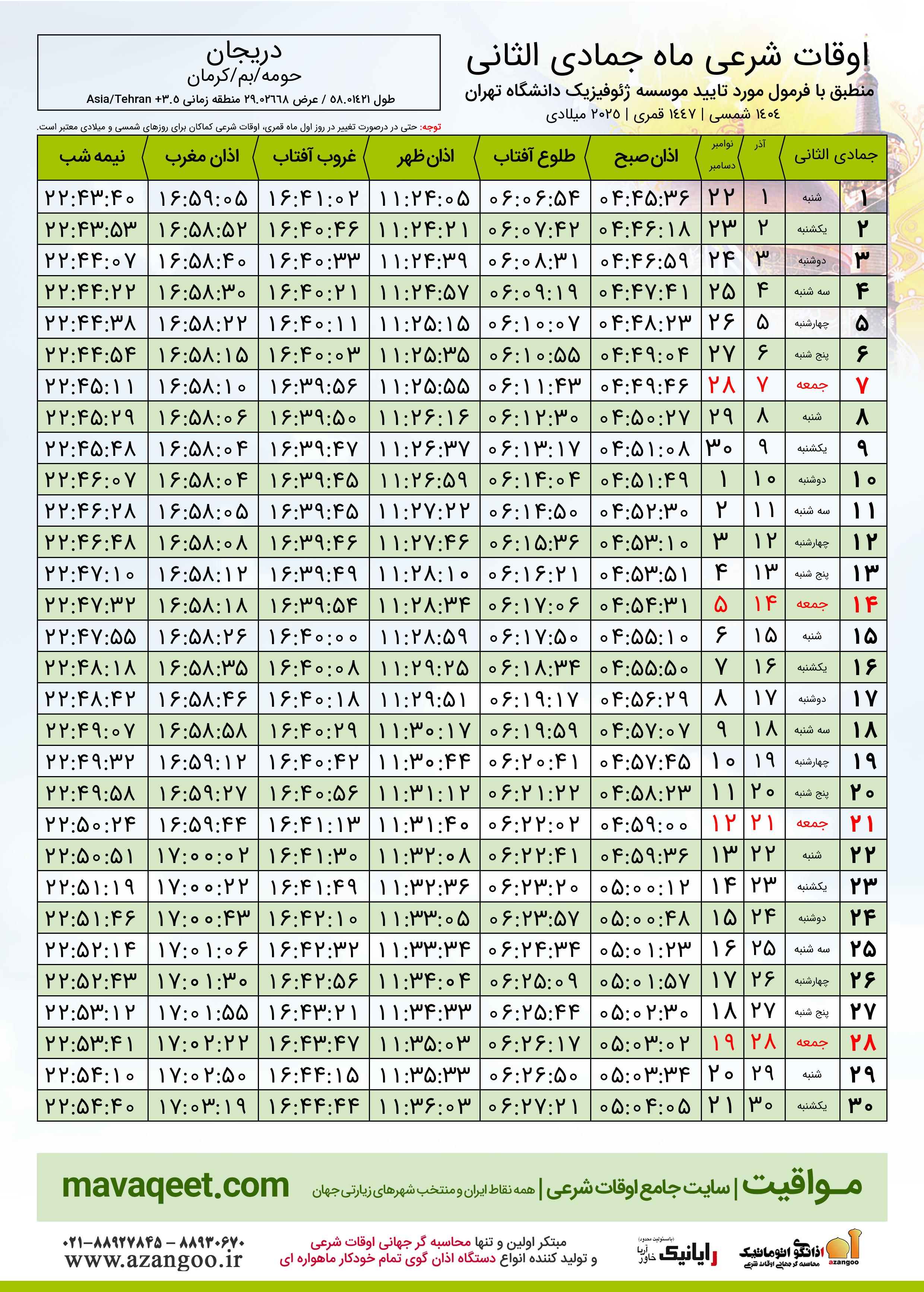 جدول اوقات شرعی جمادی الثانی ١٤٤٧ قمری روستای دریجان