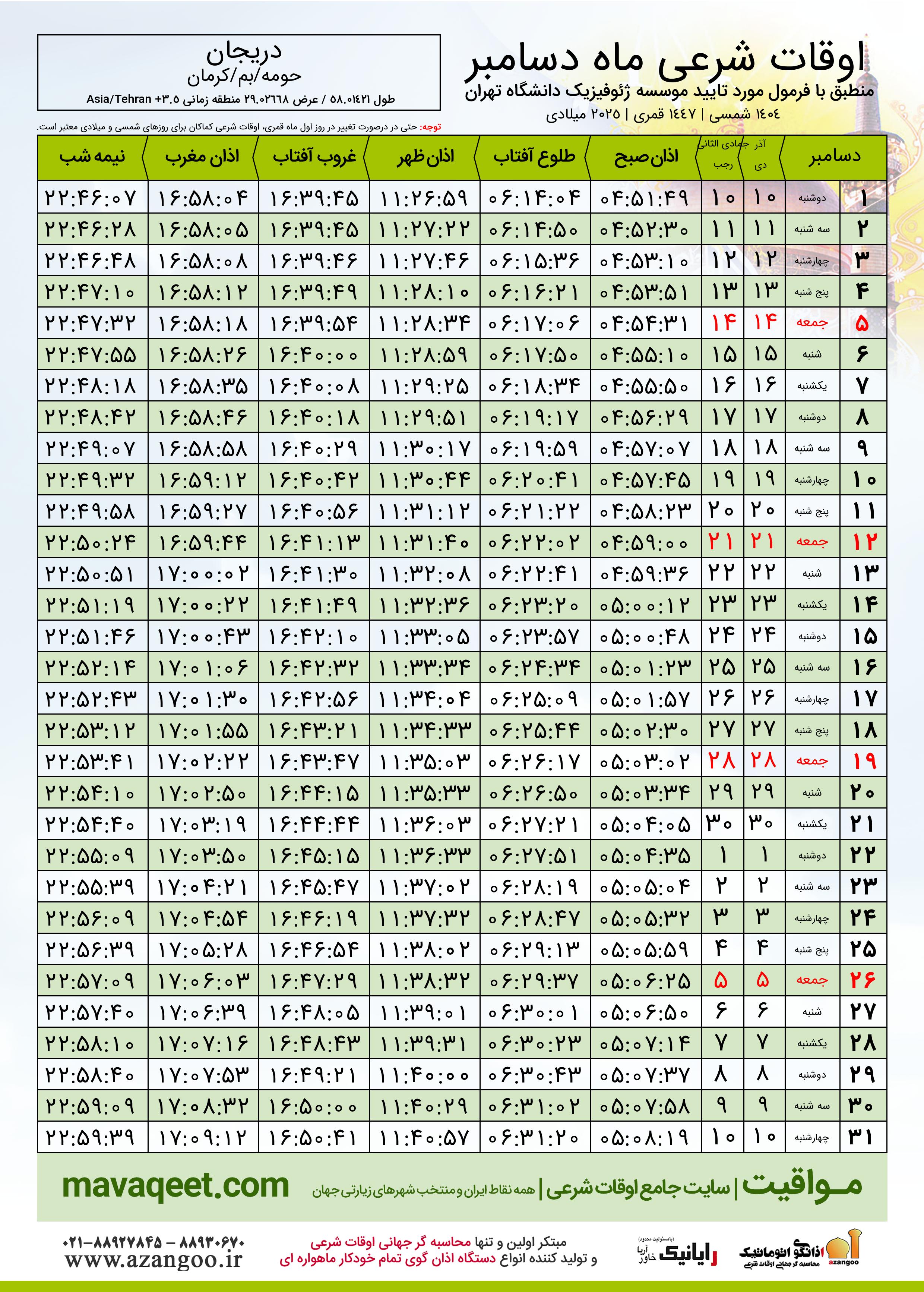 جدول اوقات شرعی آذر ١٤٠٤ شمسی روستای دریجان