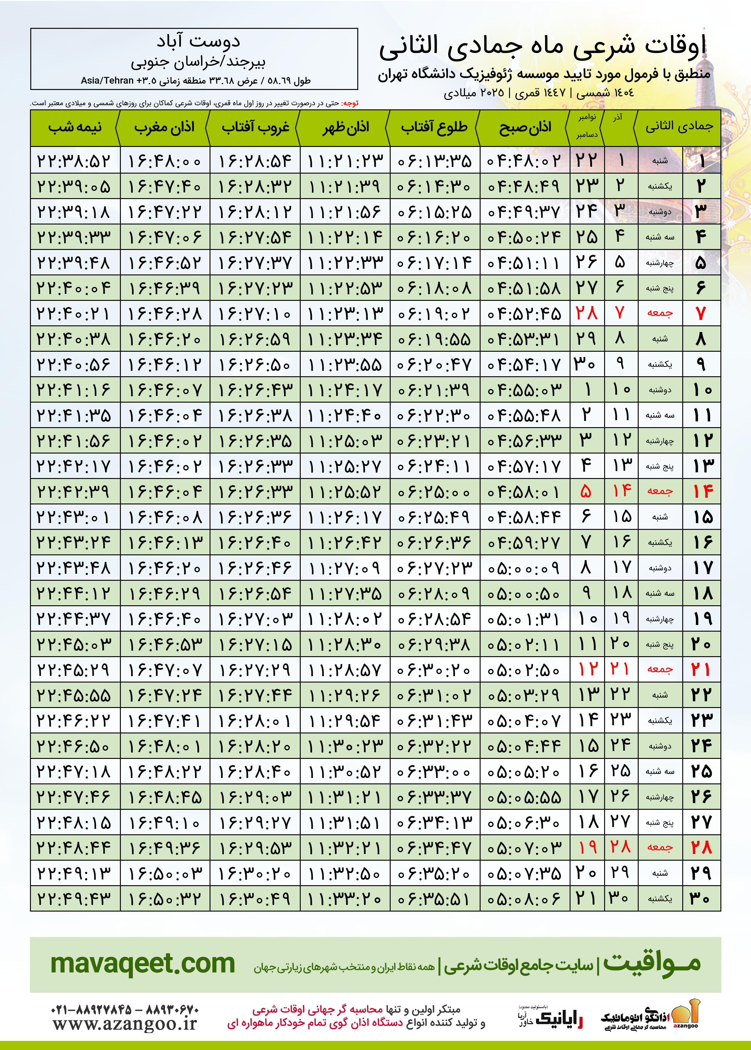 اوقات شرعی دی ١٤٠٤ شمسی شهر دوست آباد