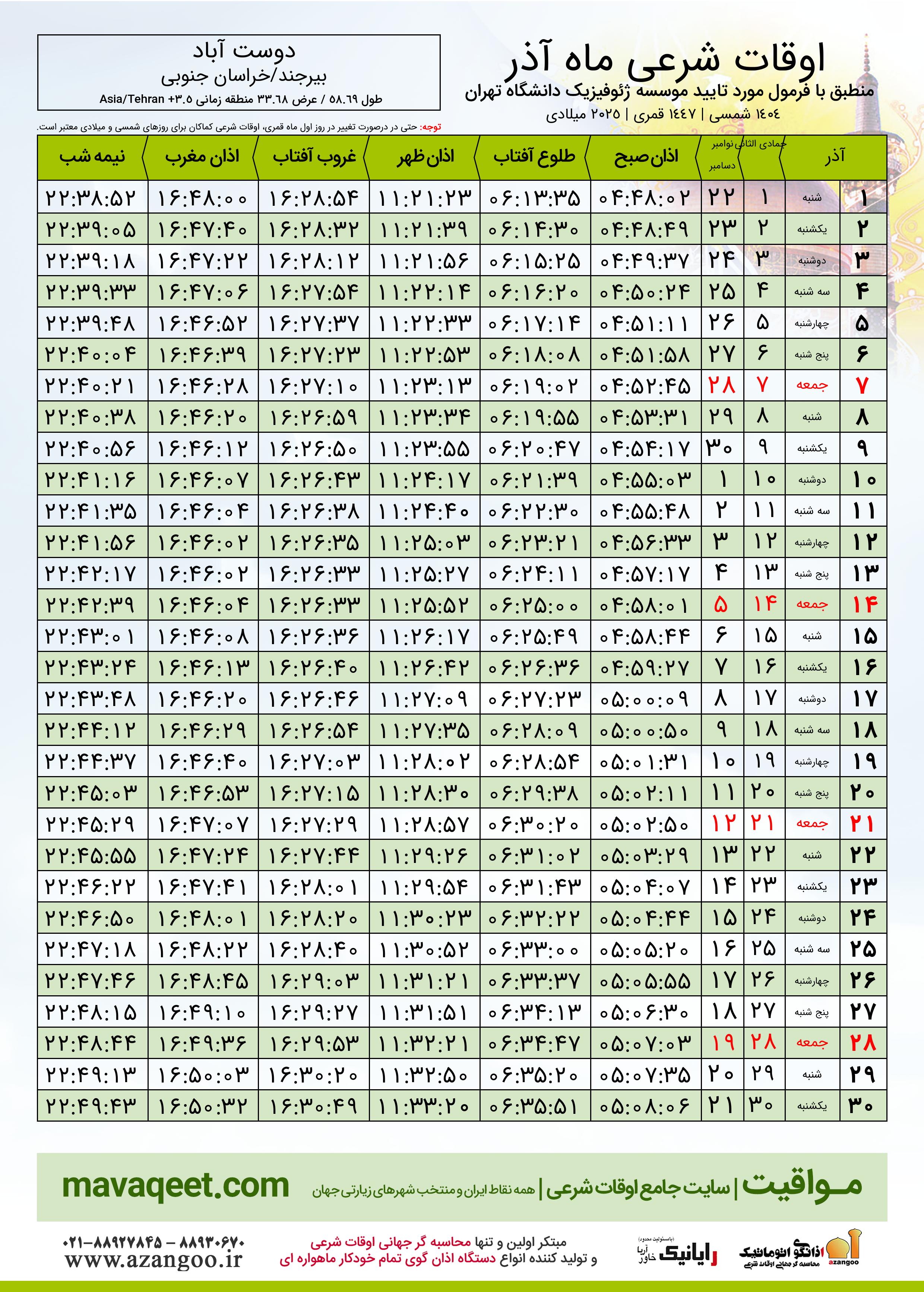 اوقات شرعی دسامبر ٢٠٢٥ میلادی شهر دوست آباد