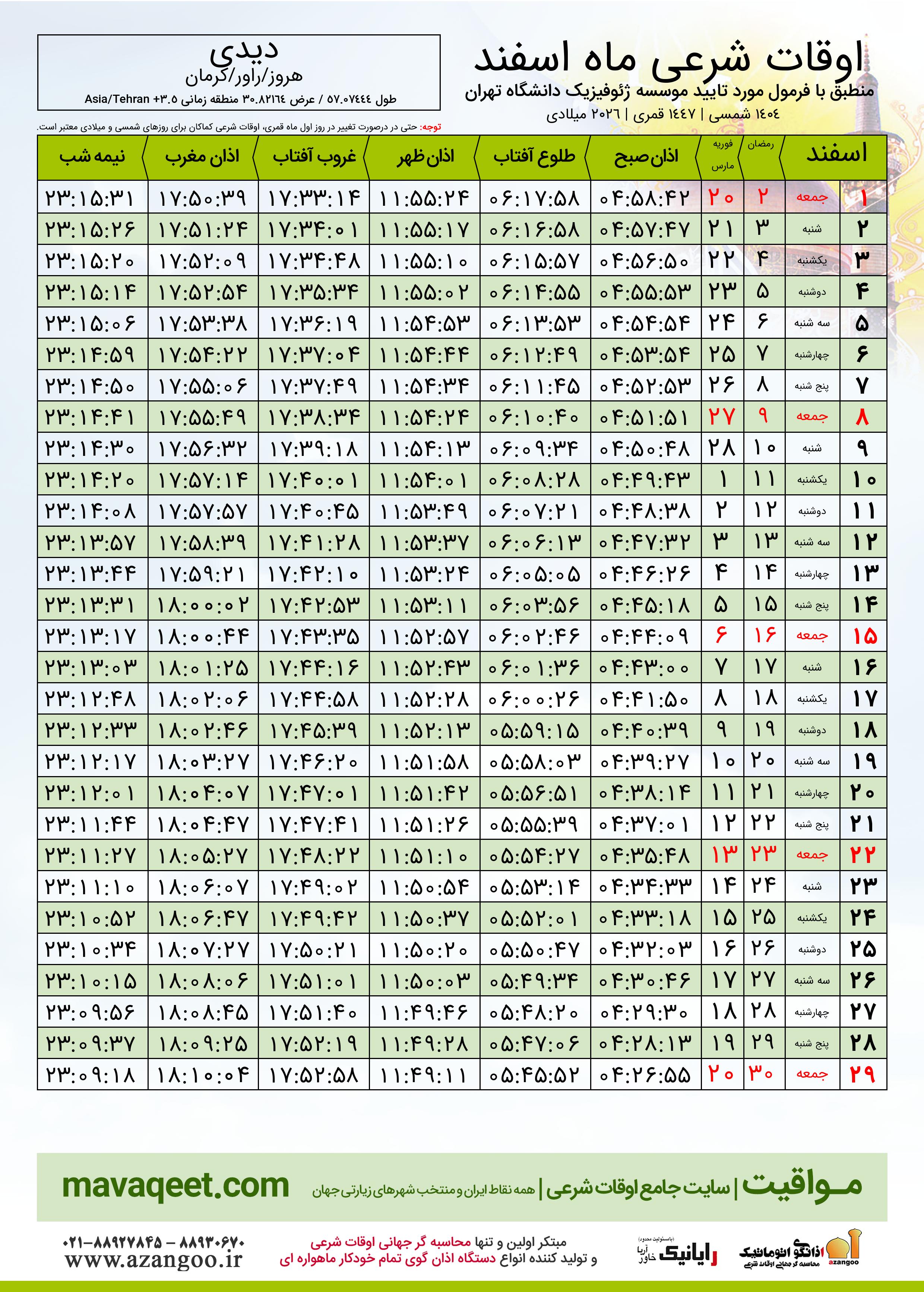اوقات شرعی ماه رمضان روستای دیدی ١٤٠٤ - ٠٤ شمسی | ٢٠٢٦ میلادی