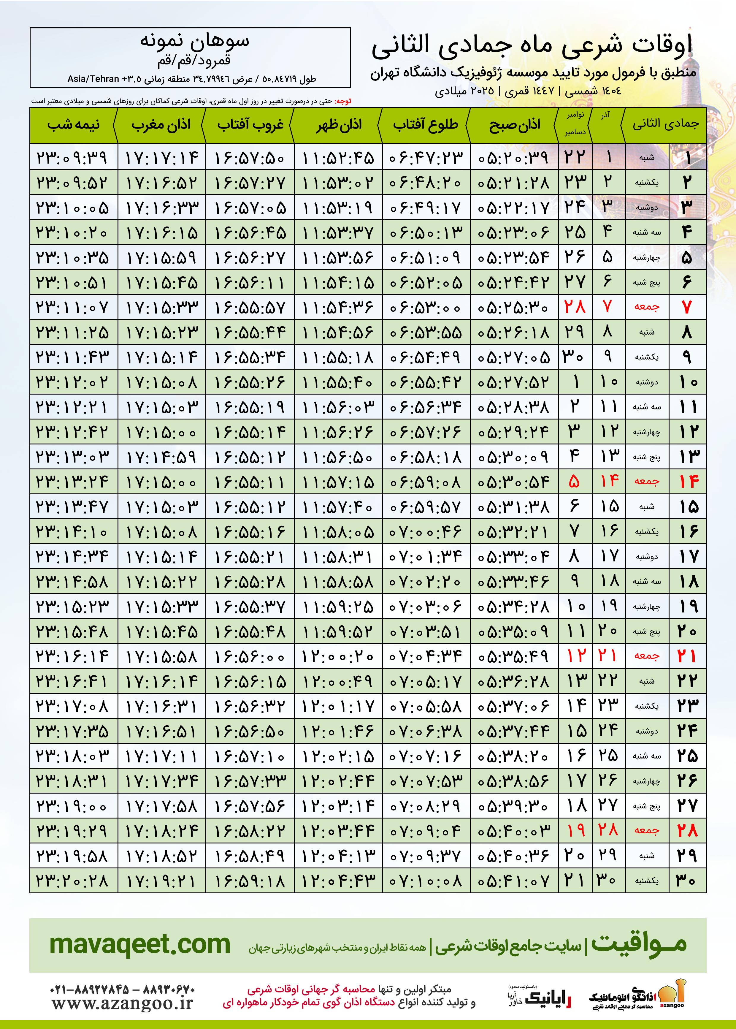 جدول اوقات شرعی جمادی الثانی ١٤٤٧ قمری روستای سوهان نمونه