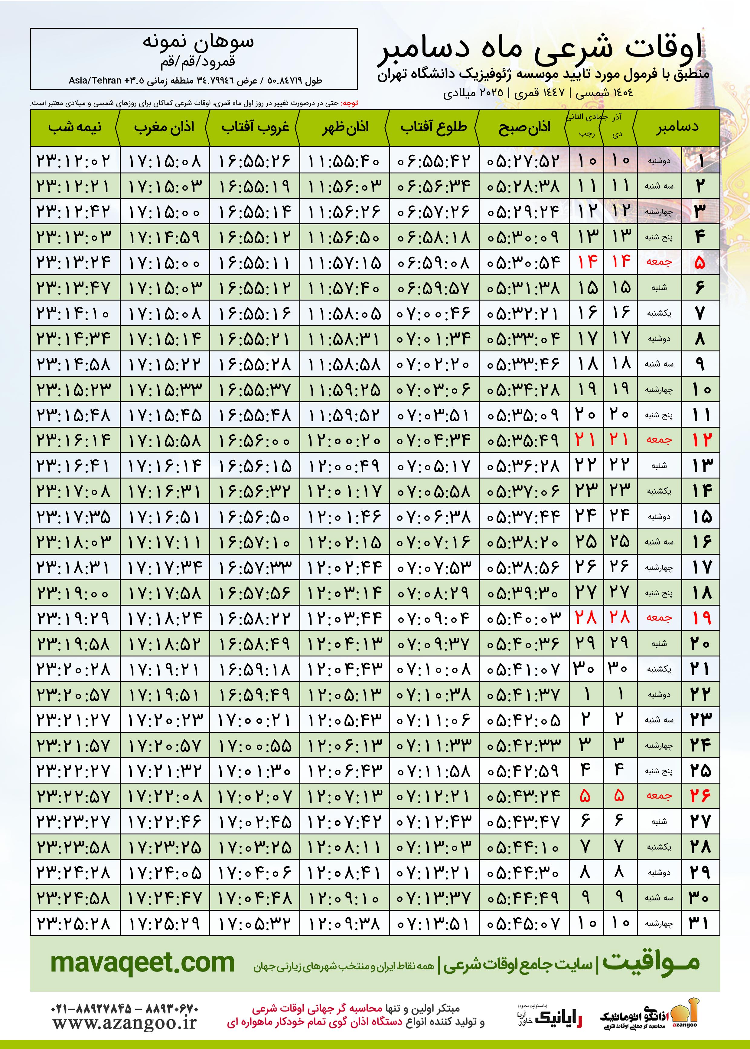 جدول اوقات شرعی دسامبر ٢٠٢٥ میلادی روستای سوهان نمونه