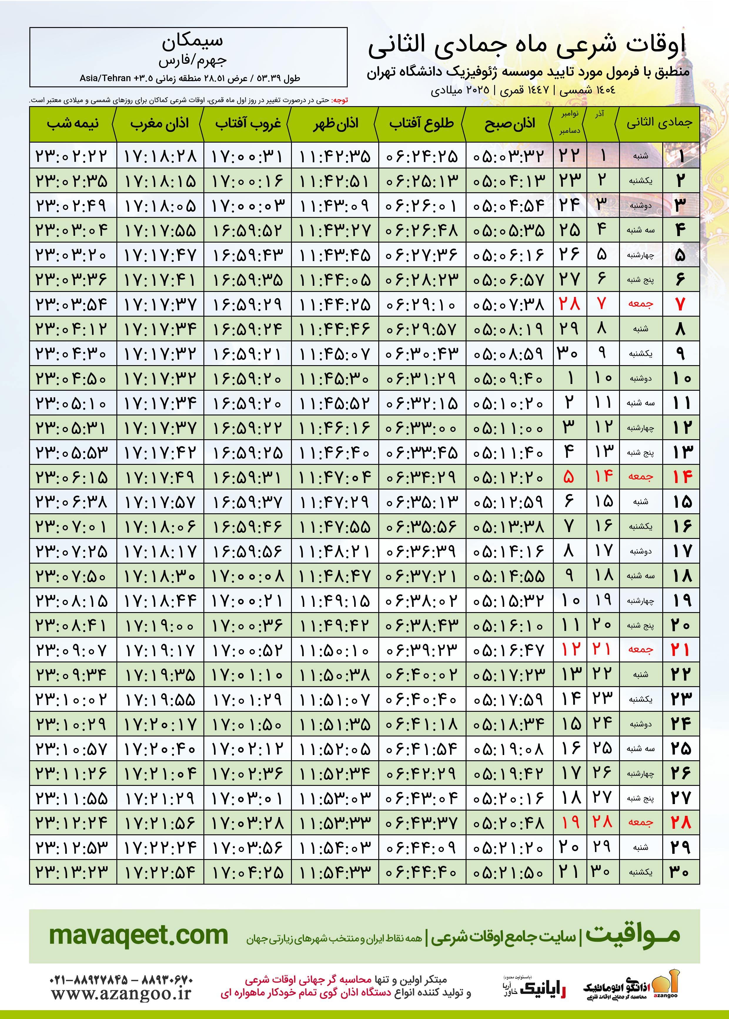 اوقات شرعی ماه رجب ١٤٤٧ هـ.ق شهر سیمکان بر