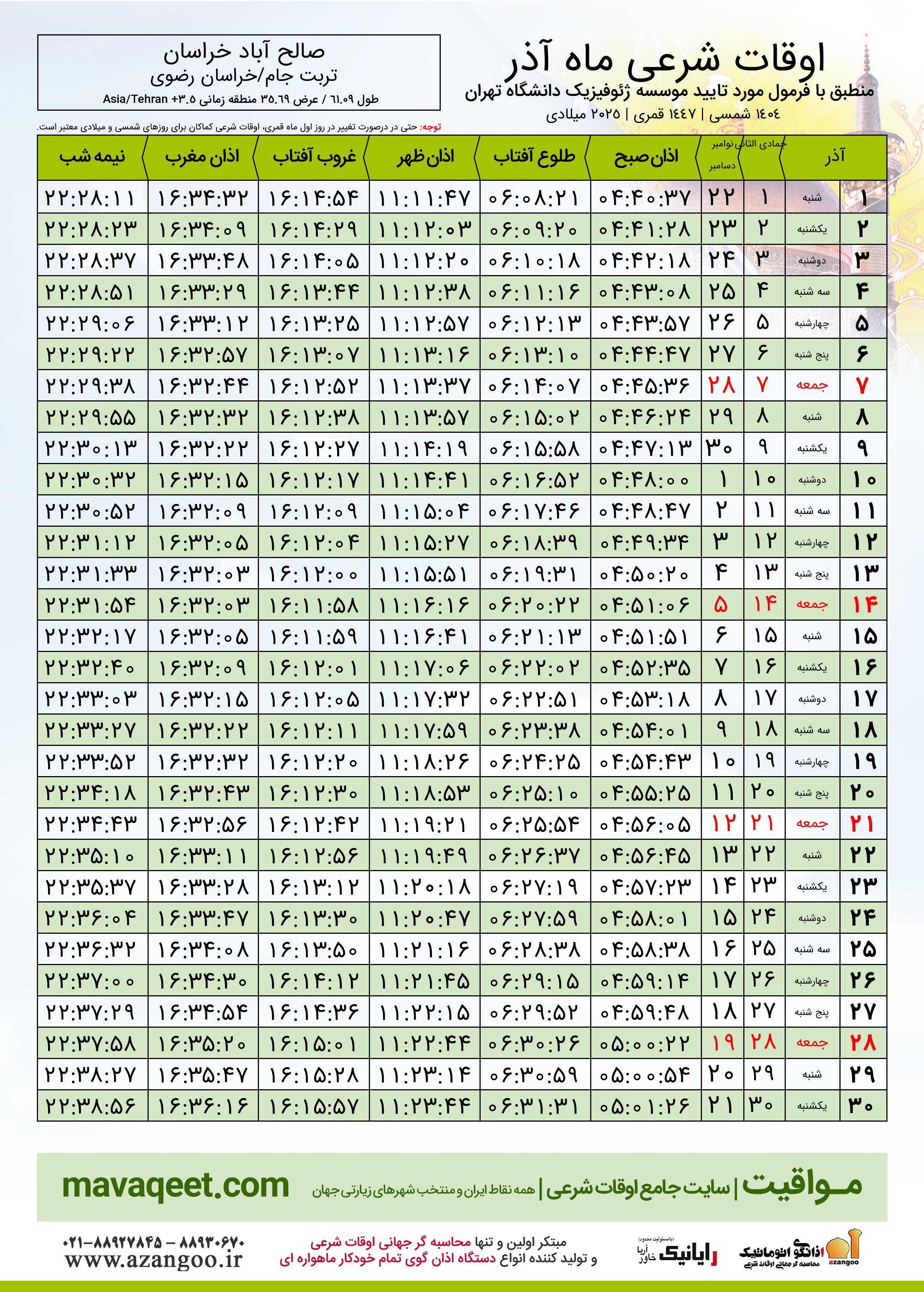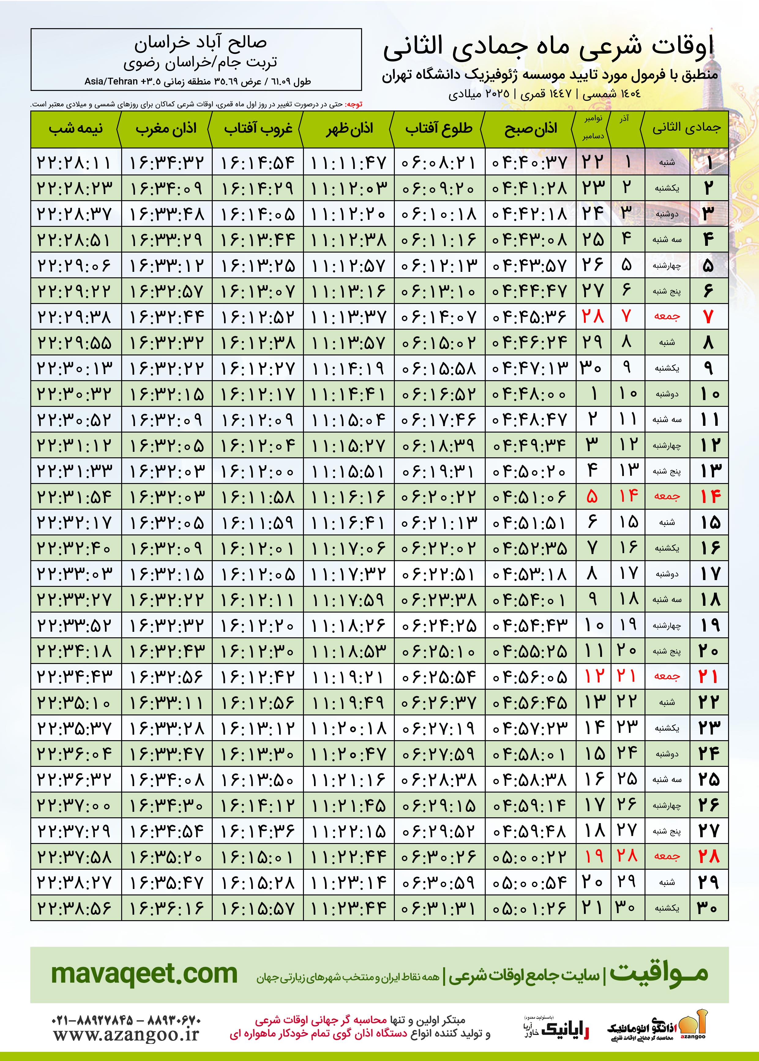 اوقات شرعی ماه رجب ١٤٤٧ هـ.ق شهر صالح آباد خراسان بر