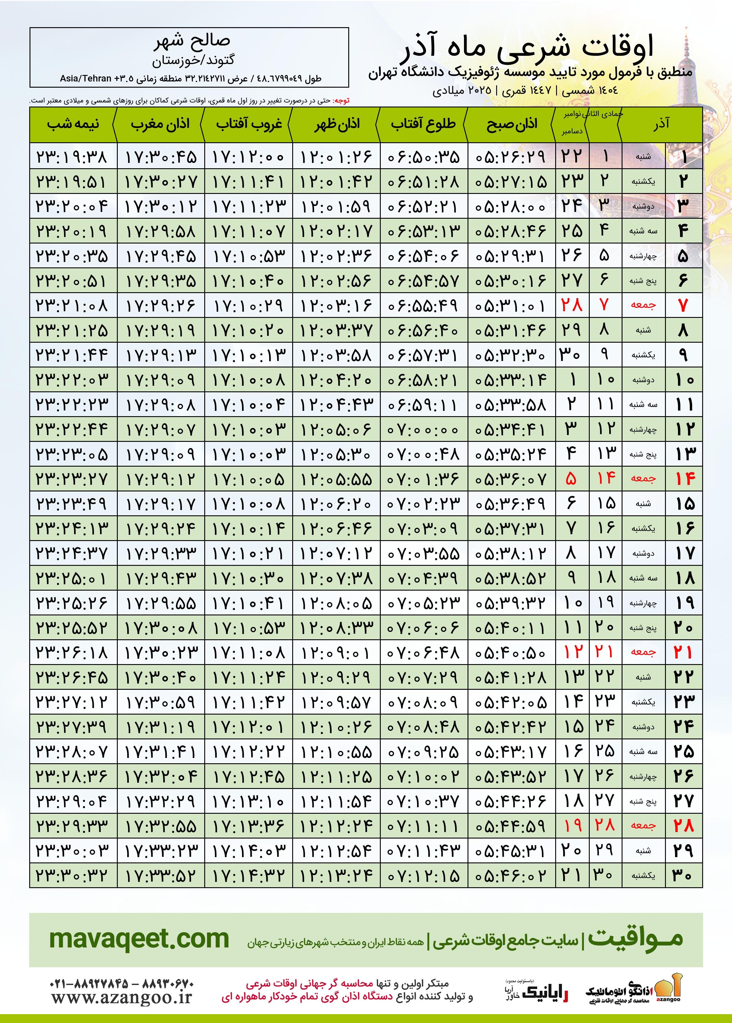 جدول اوقات شرعی دسامبر ٢٠٢٥ میلادی شهر صالح شهر