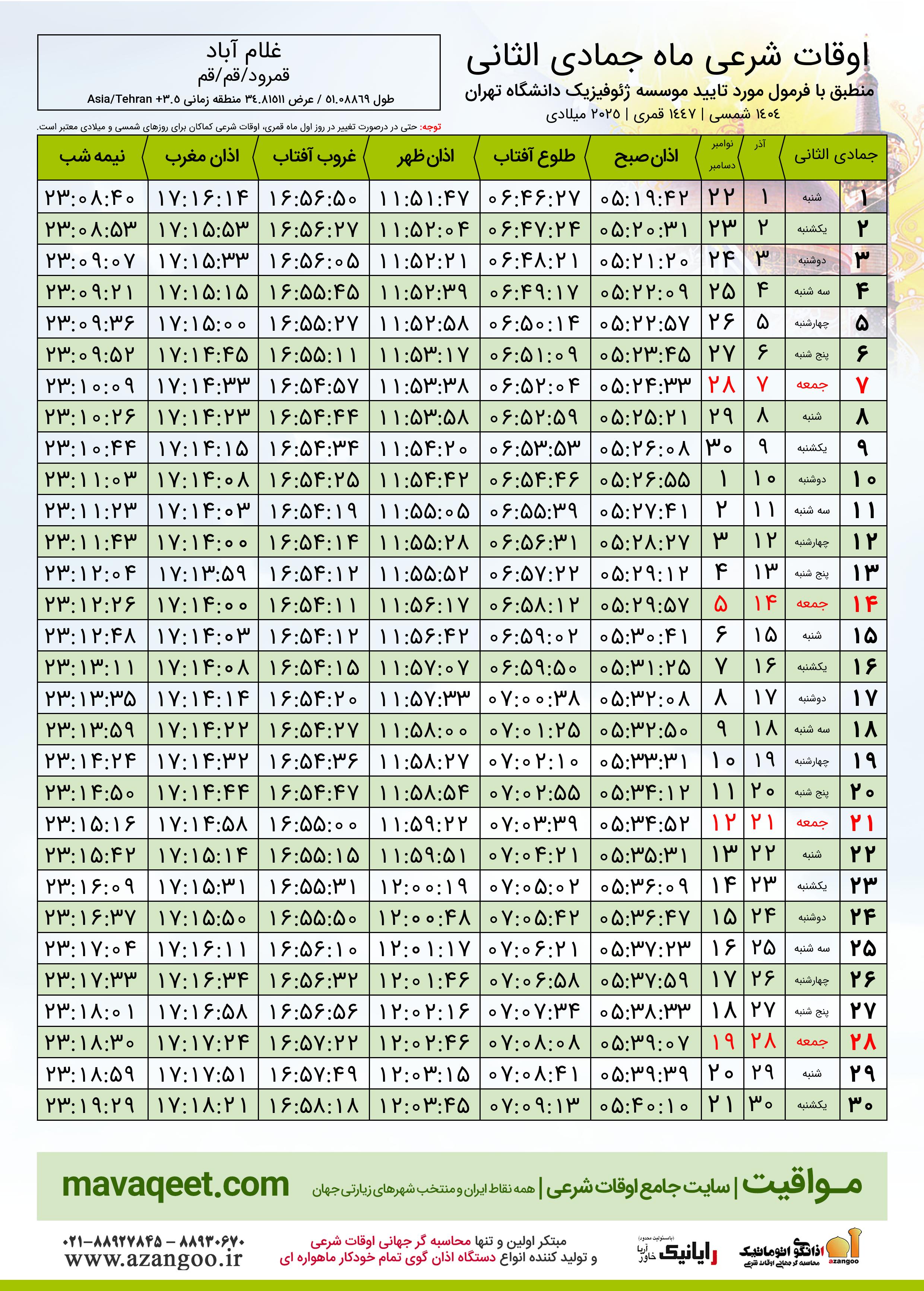 جدول اوقات شرعی جمادی الثانی ١٤٤٧ قمری روستای غلام آباد