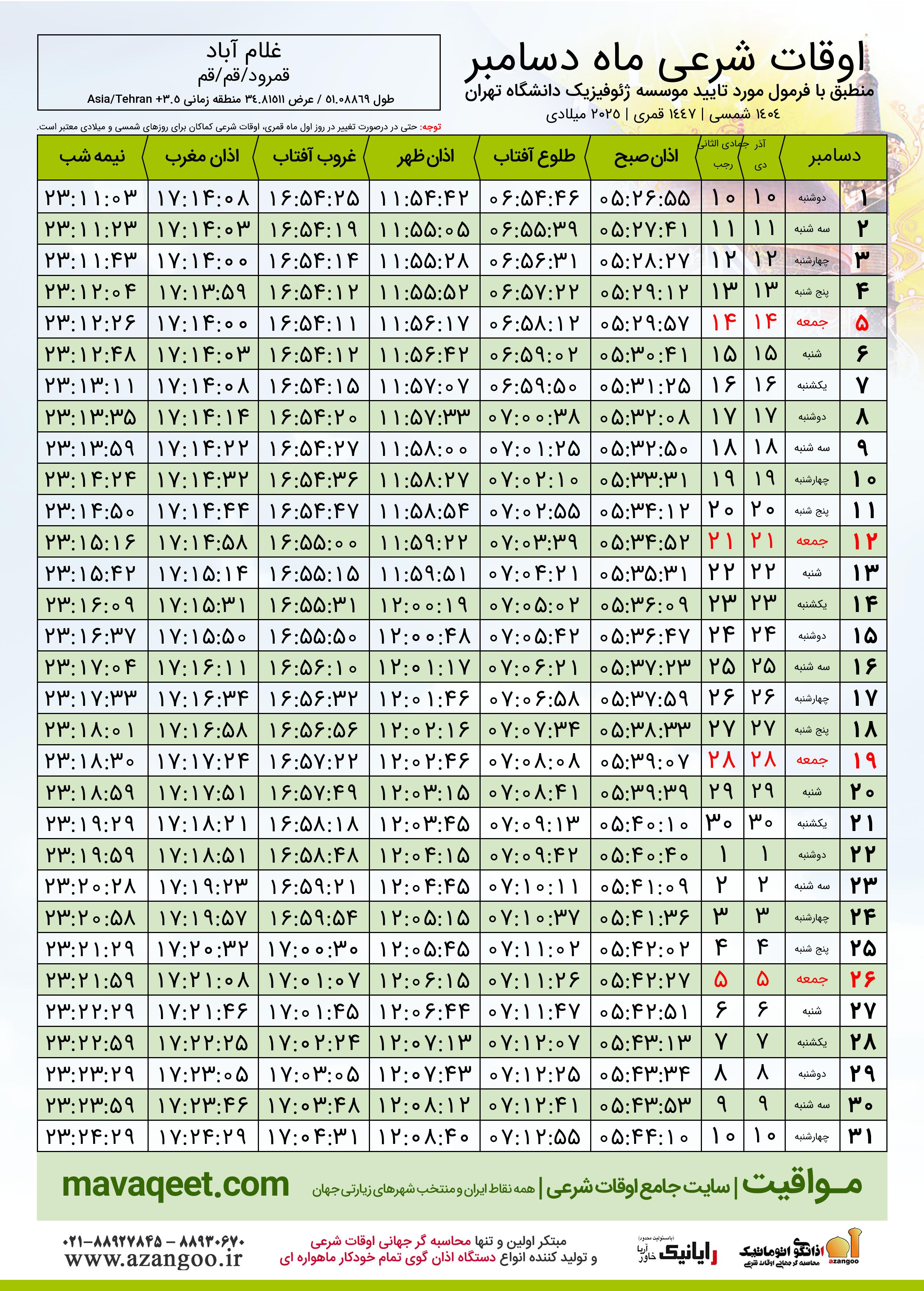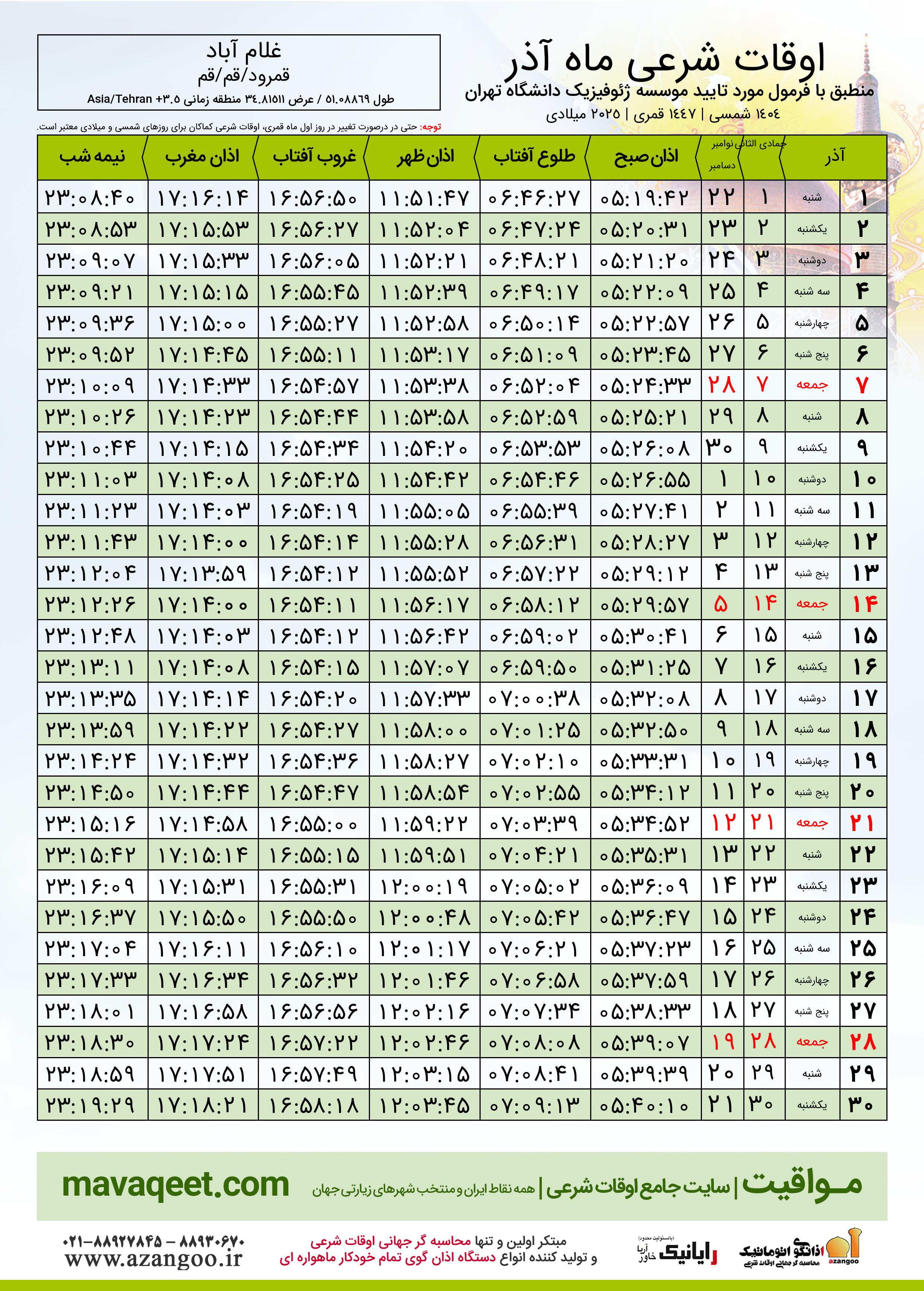 جدول اوقات شرعی آذر ١٤٠٤ شمسی روستای غلام آباد