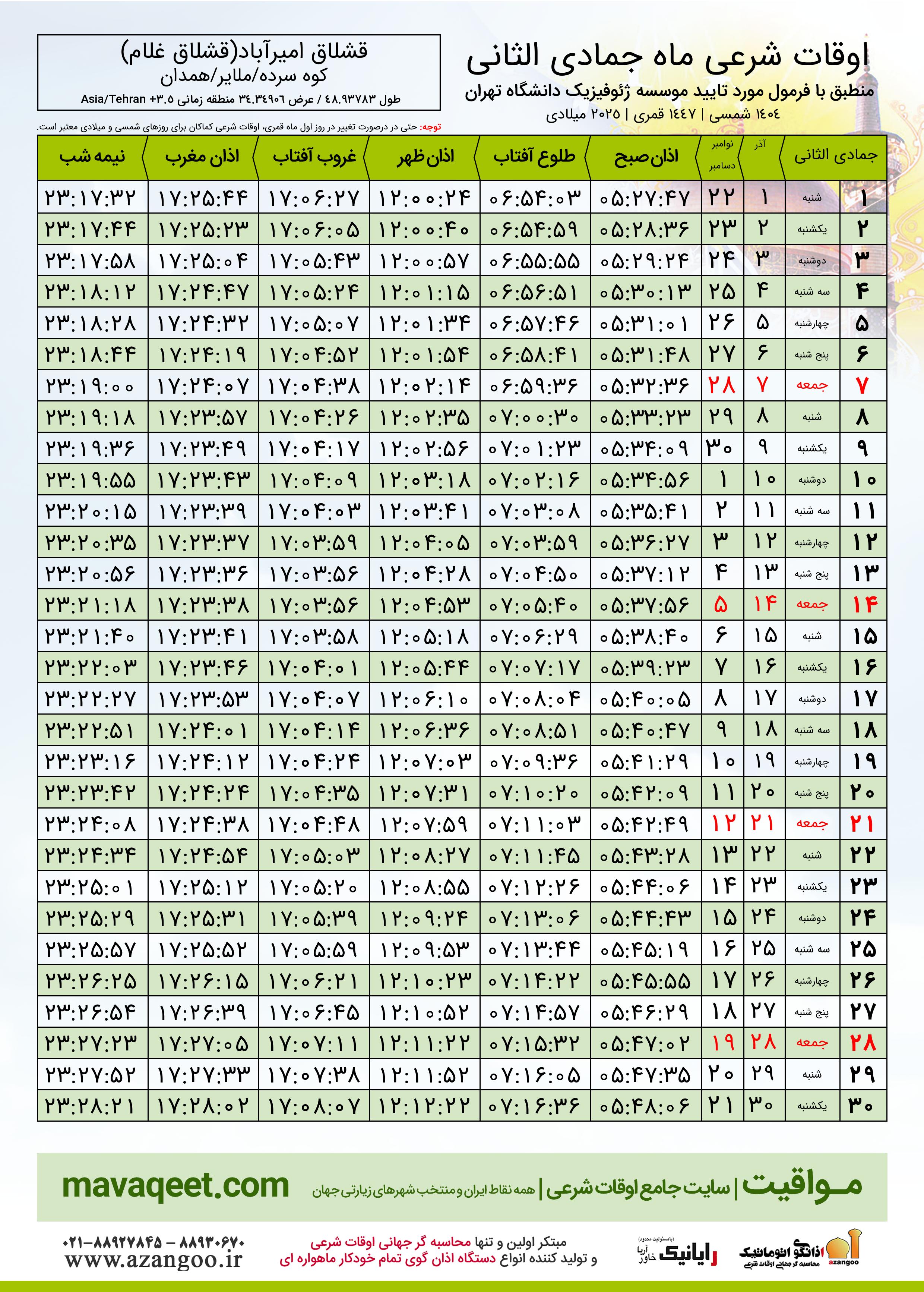 جدول اوقات شرعی جمادی الثانی ١٤٤٧ قمری روستای قشلاق امیرآباد(قشلاق غلام)