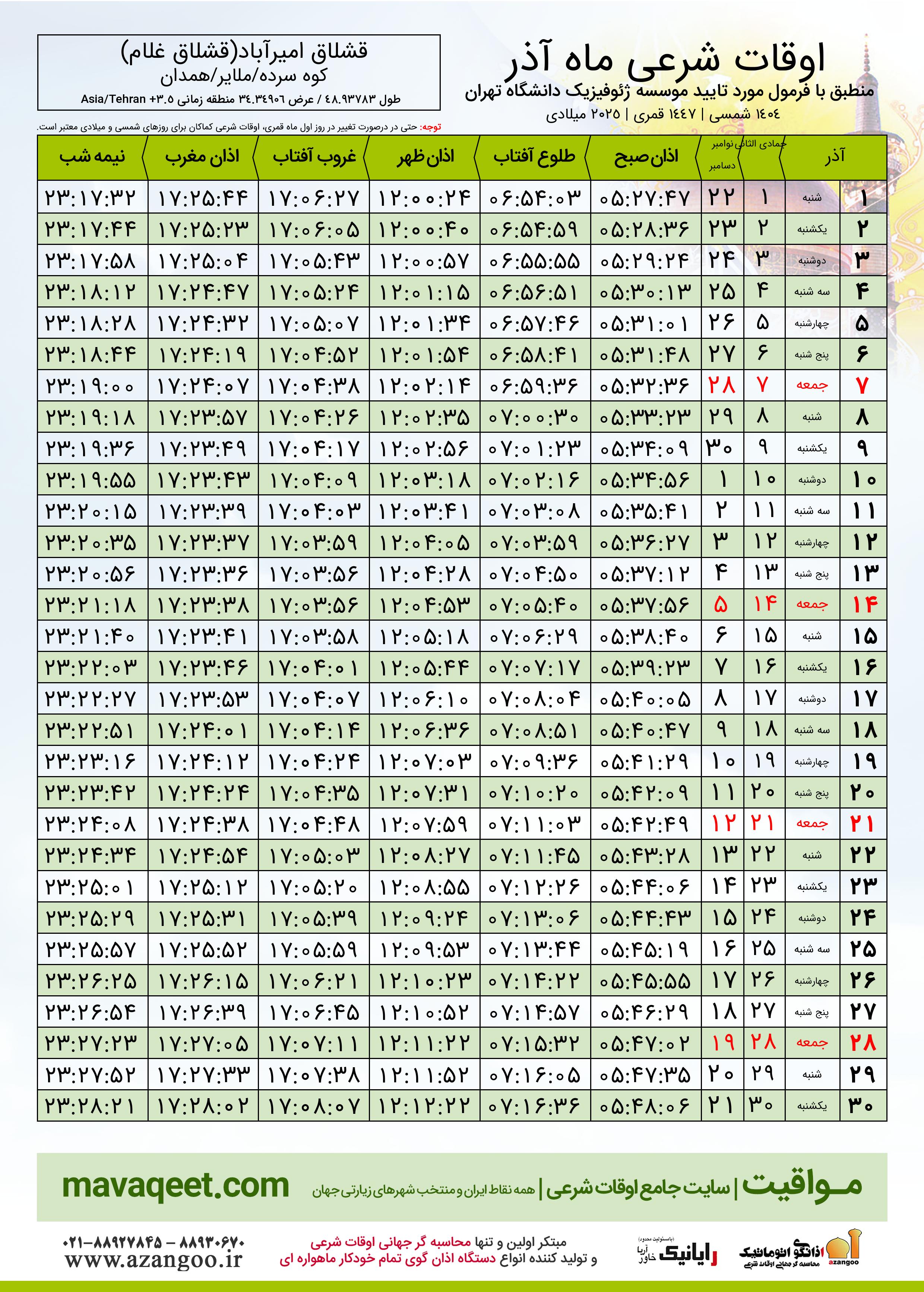 جدول اوقات شرعی آذر ١٤٠٤ شمسی روستای قشلاق امیرآباد(قشلاق غلام)