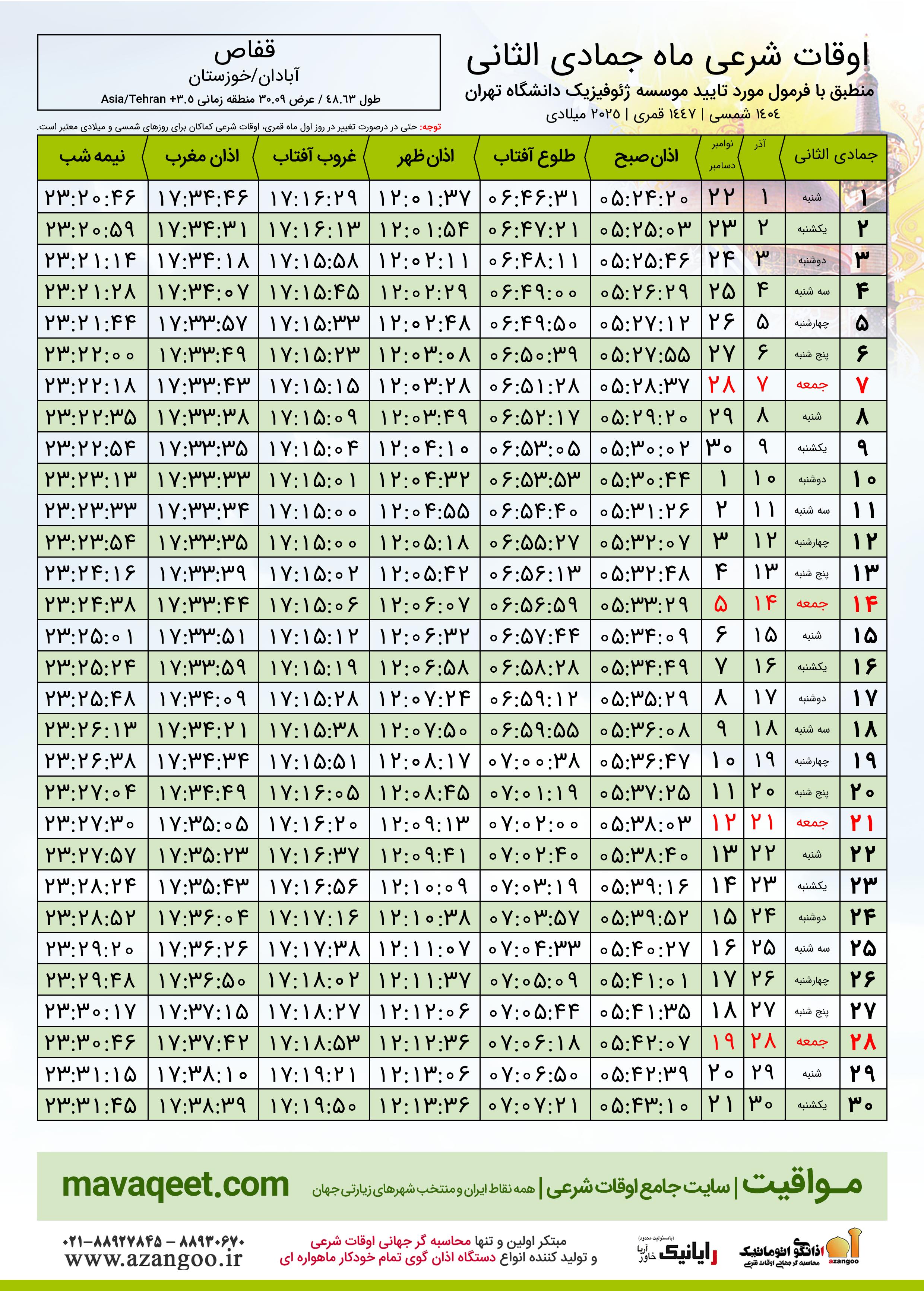 جهت نمایش تصویر جدول اوقات شرعی ماه رمضان ٠٤ - ١٤٠٤ شمسی | ٢٠٢٦ میلادی | ١٤٤٧ قمری شهر قفاص در