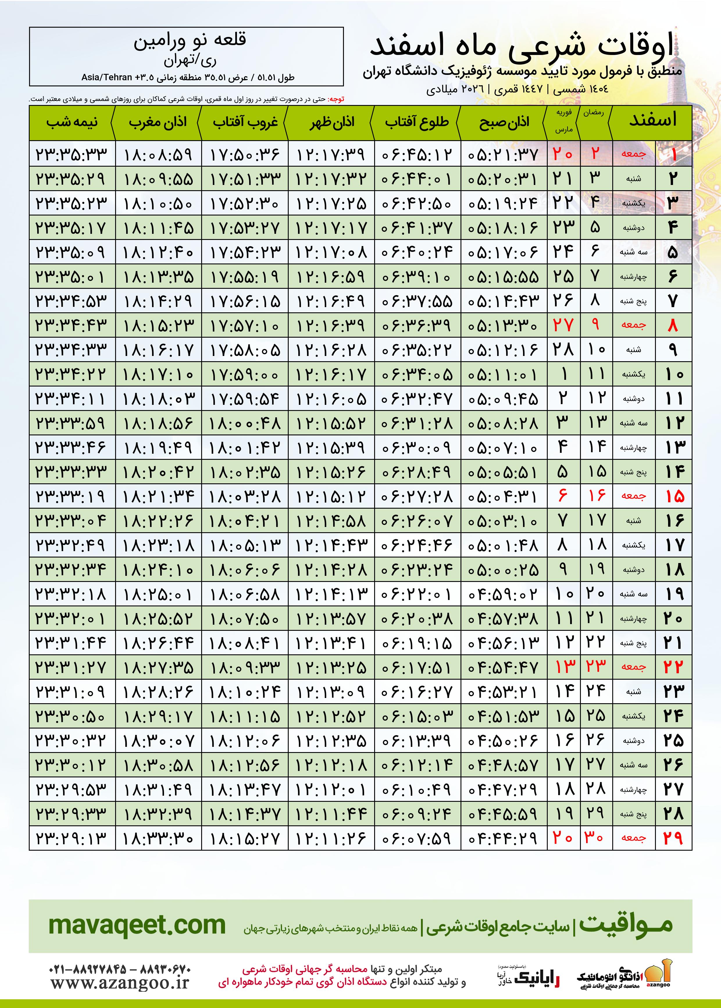 جدول اوقات شرعی رمضان ١٤٤٧ قمری شهر قلعه نو ورامین