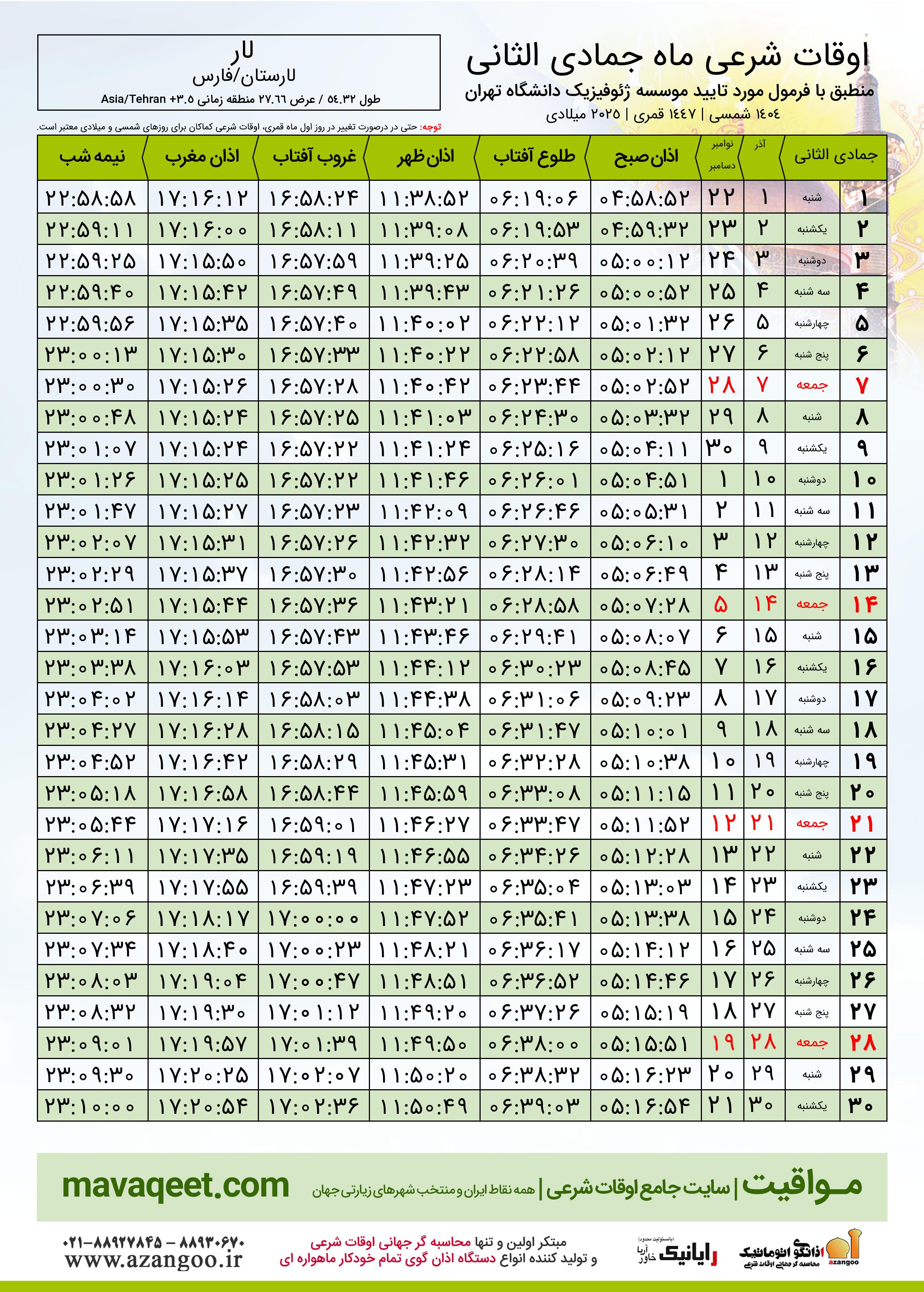 جدول اوقات شرعی دسامبر ٢٠٢٥ میلادی شهر لار