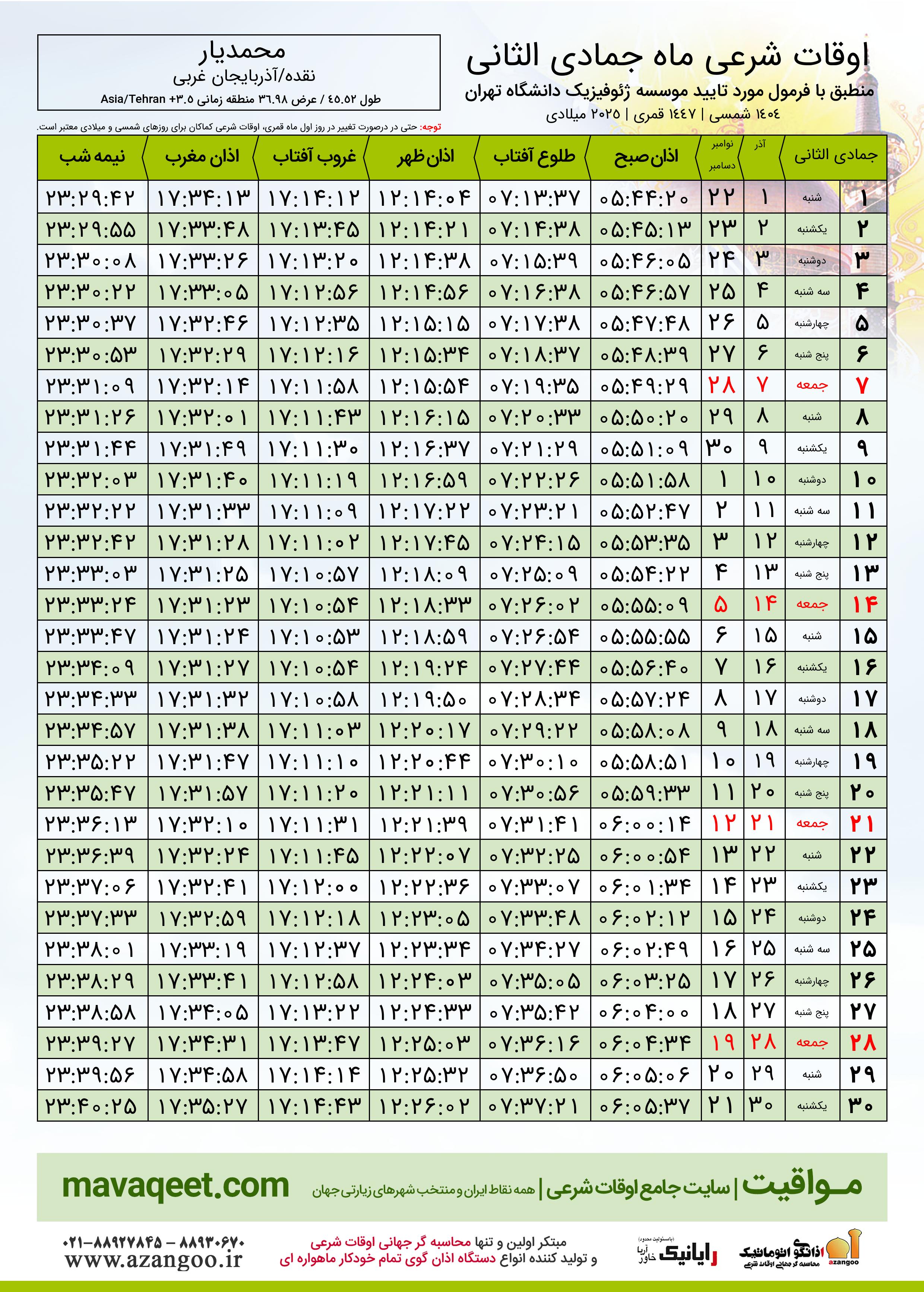 اوقات شرعی ماه جمادی الثانی ١٤٤٧ هـ.ق شهر محمدیار بر