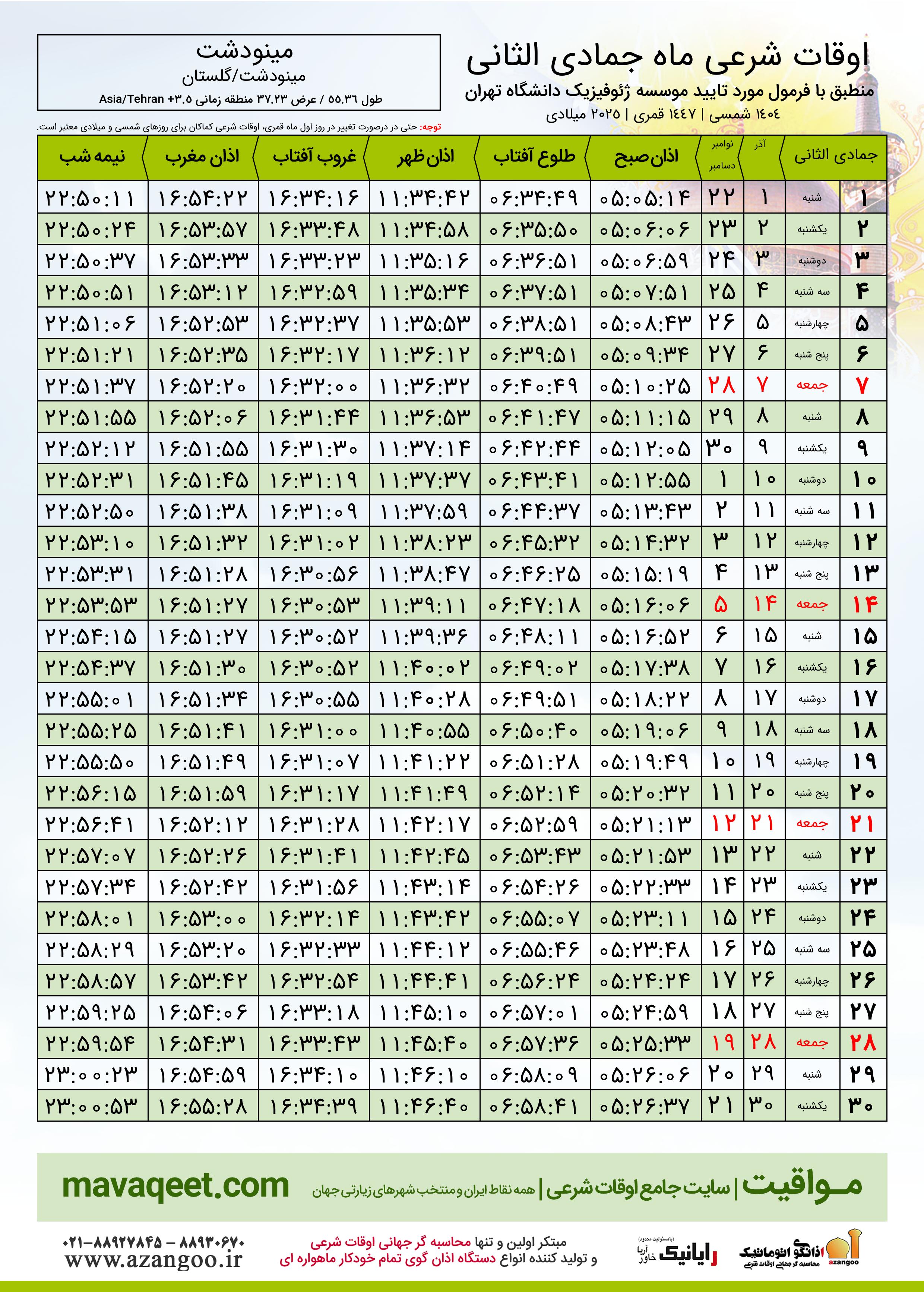 اوقات شرعی ماه رجب ١٤٤٧ هـ.ق شهر مینودشت بر