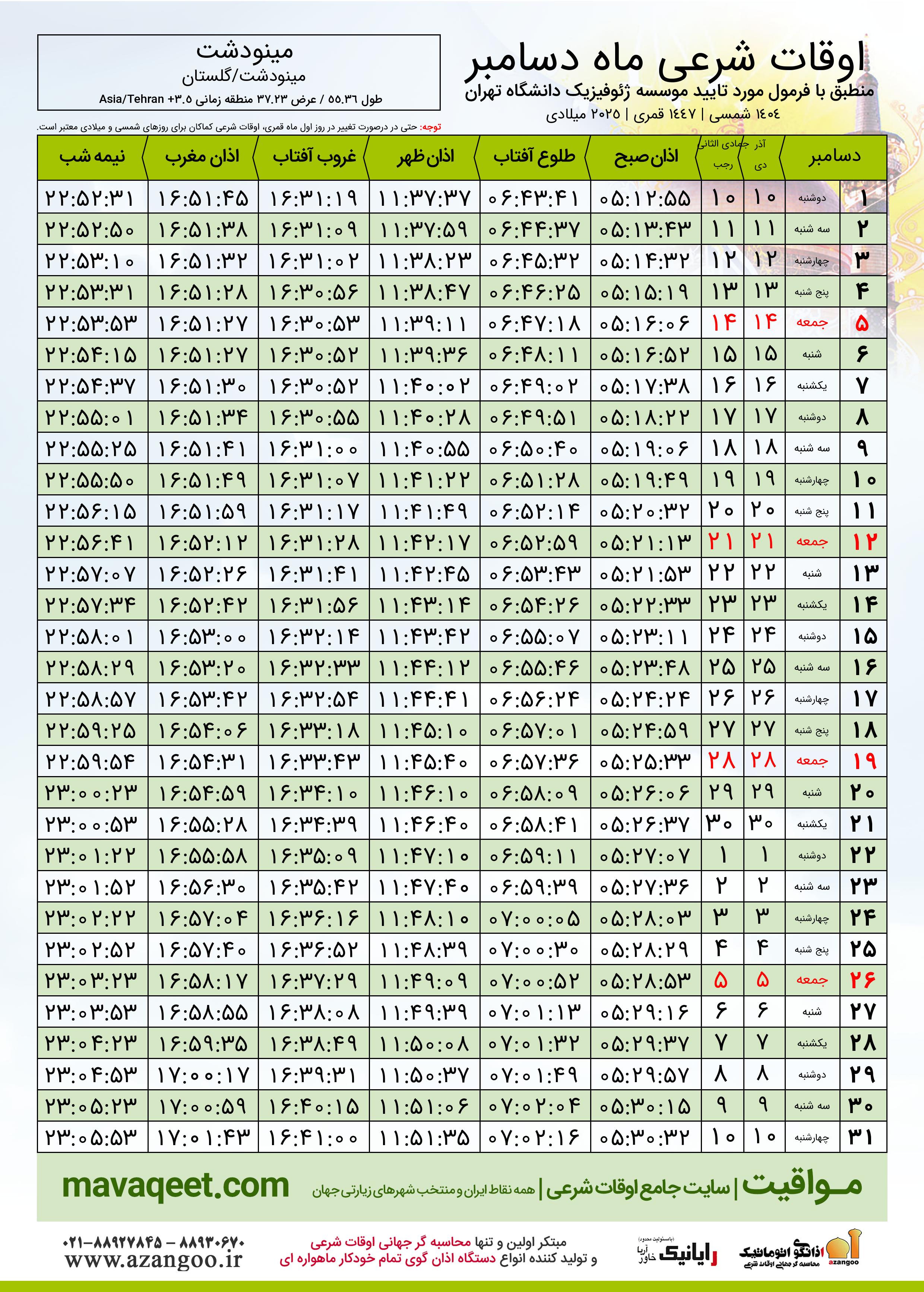 جدول اوقات شرعی دسامبر ٢٠٢٥ میلادی شهر مینودشت