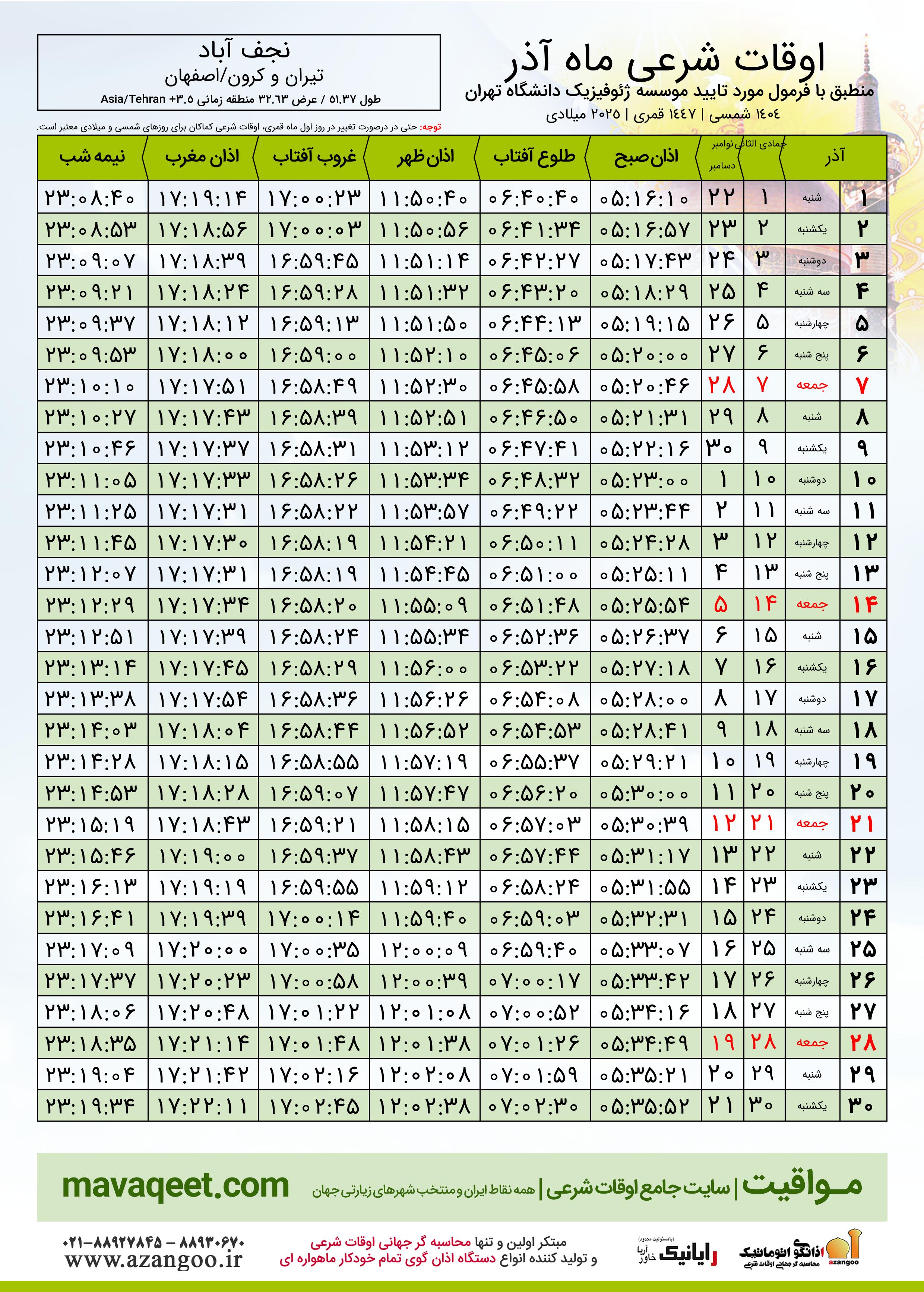 دانلود اوقات شرعی دسامبر ٢٠٢٥ شهر نجف آباد