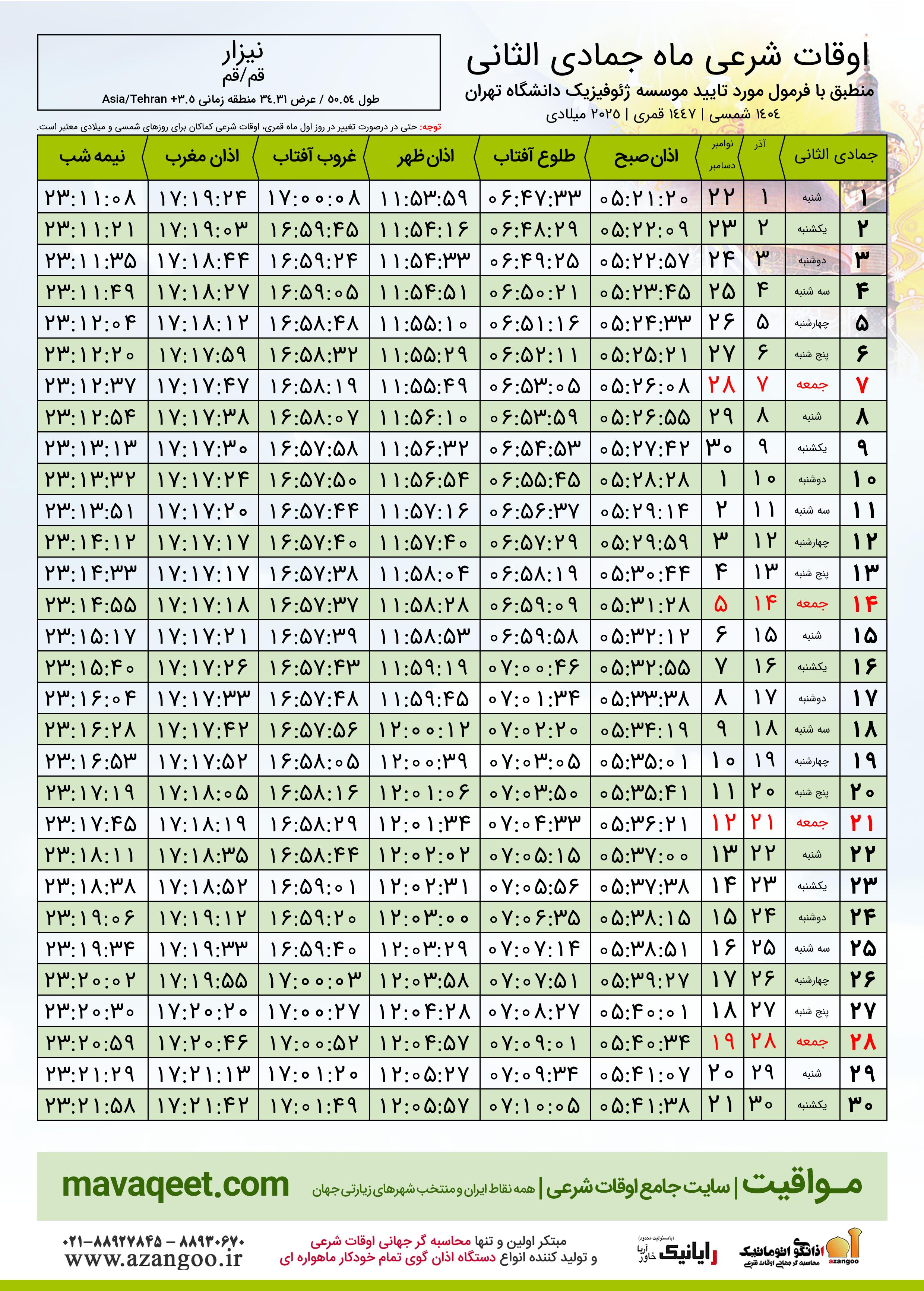 جدول اوقات شرعی جمادی الثانی ١٤٤٧ قمری شهر نیزار