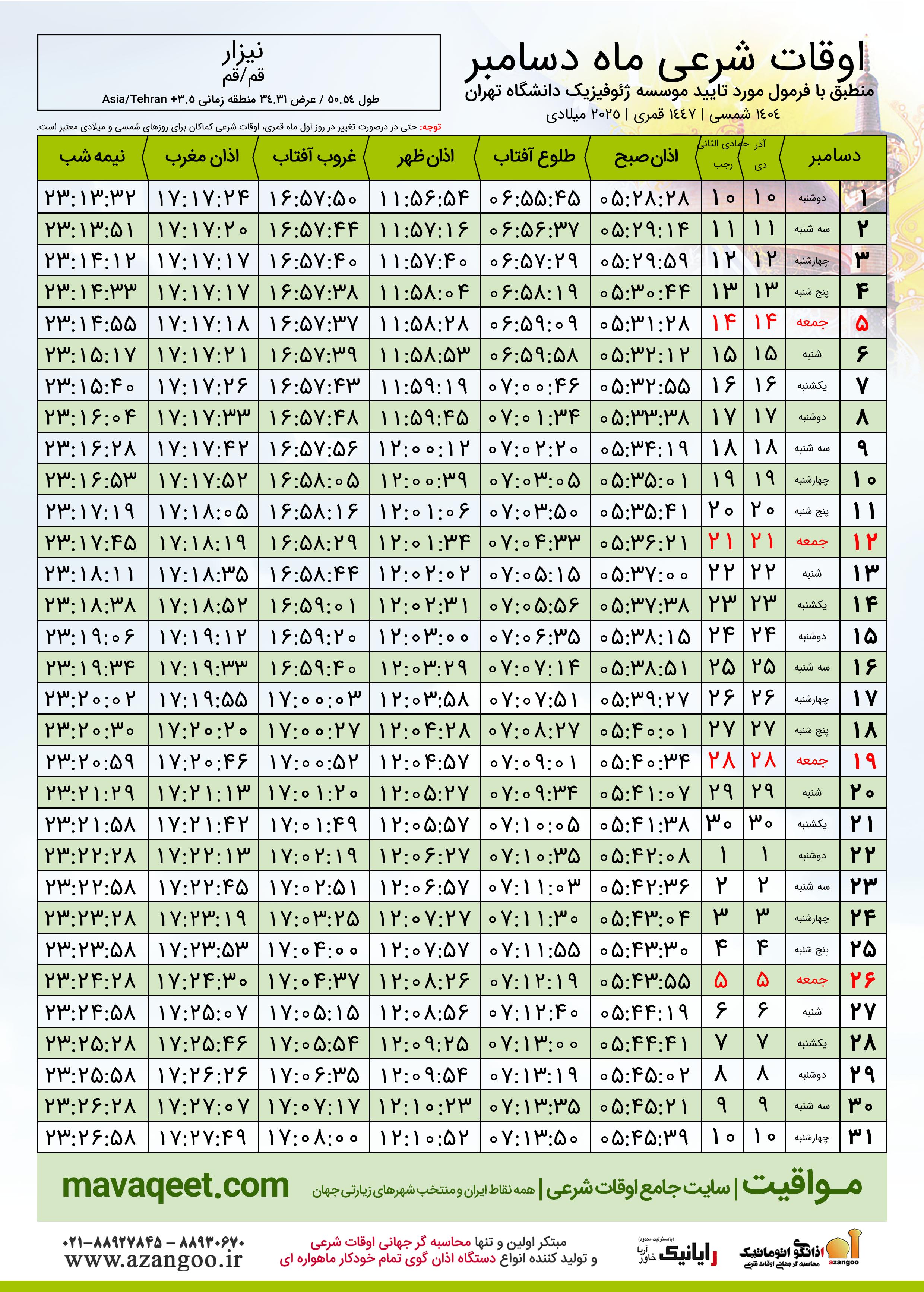 جدول اوقات شرعی دسامبر ٢٠٢٥ میلادی شهر نیزار