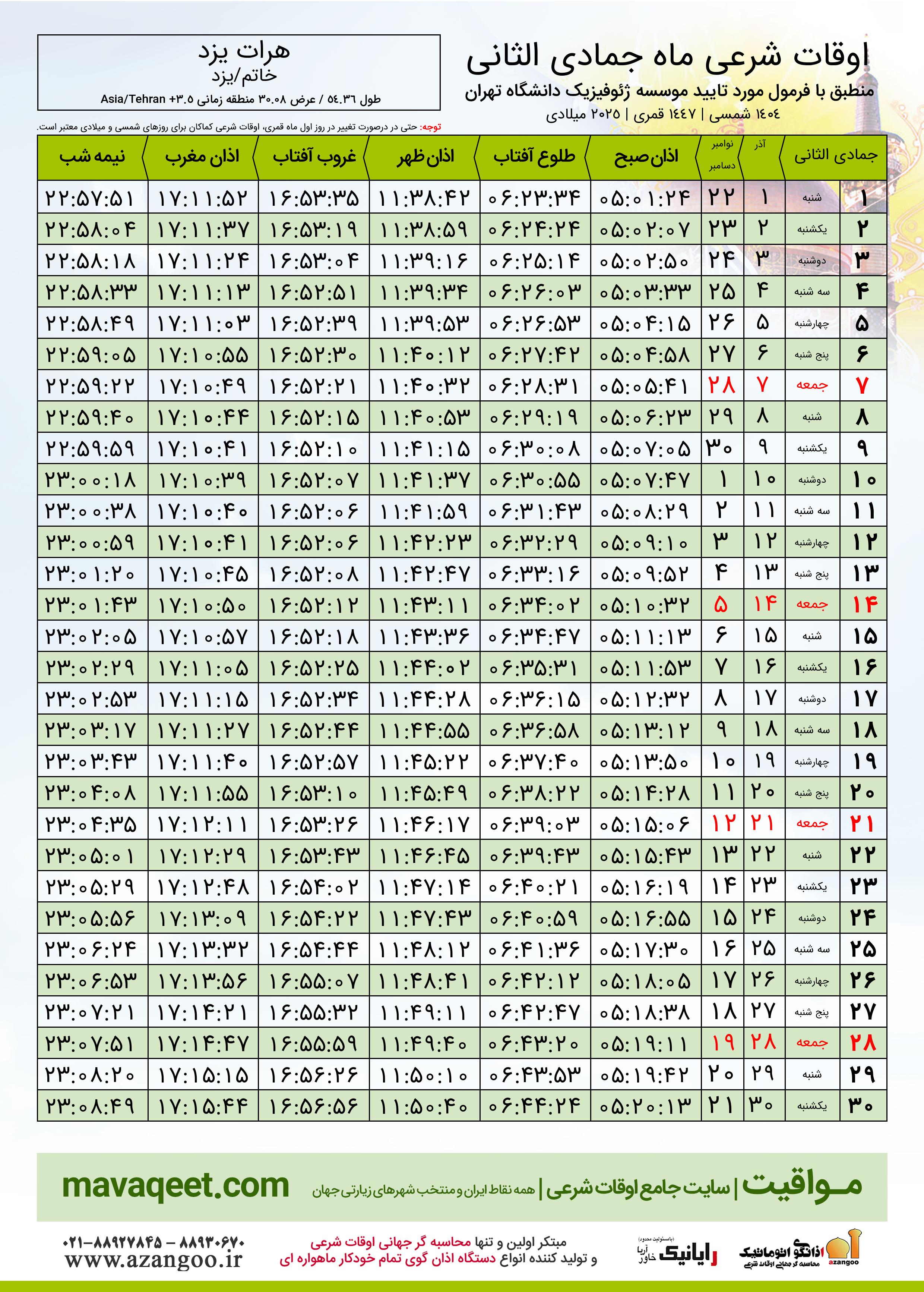 دانلود اوقات شرعی ماه رمضان ٠٤ - ١٤٠٤ شمسی | ٢٠٢٦ میلادی | ١٤٤٧ قمری شهر هرات یزد