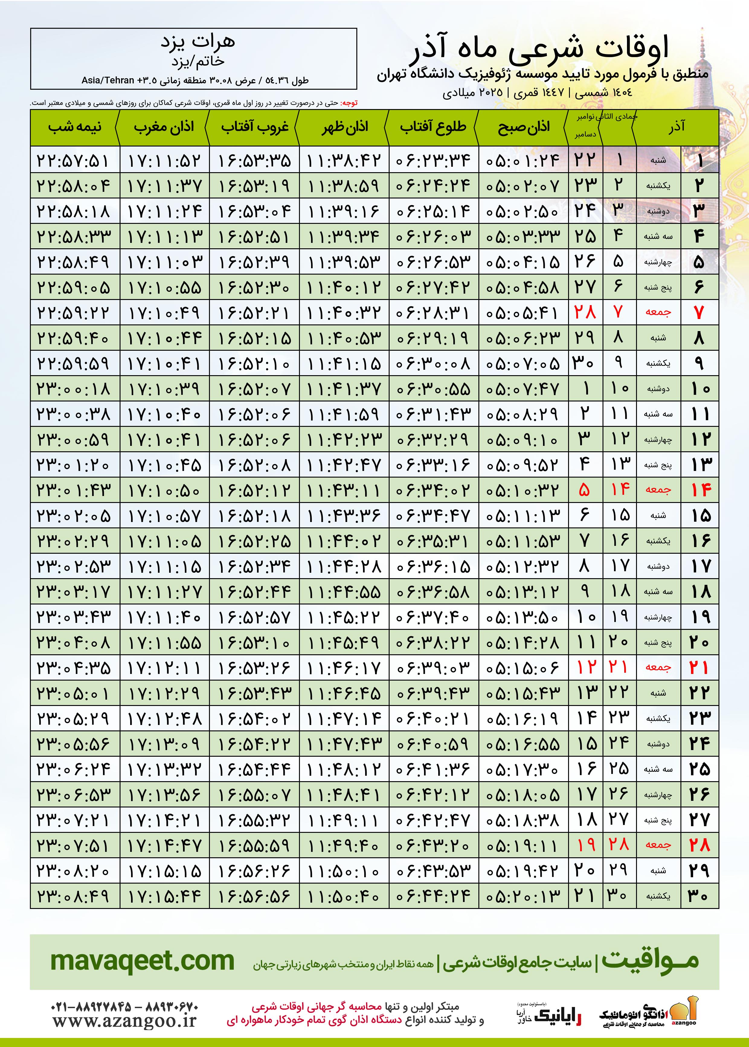 اوقات شرعی دسامبر ٢٠٢٥ میلادی شهر هرات یزد