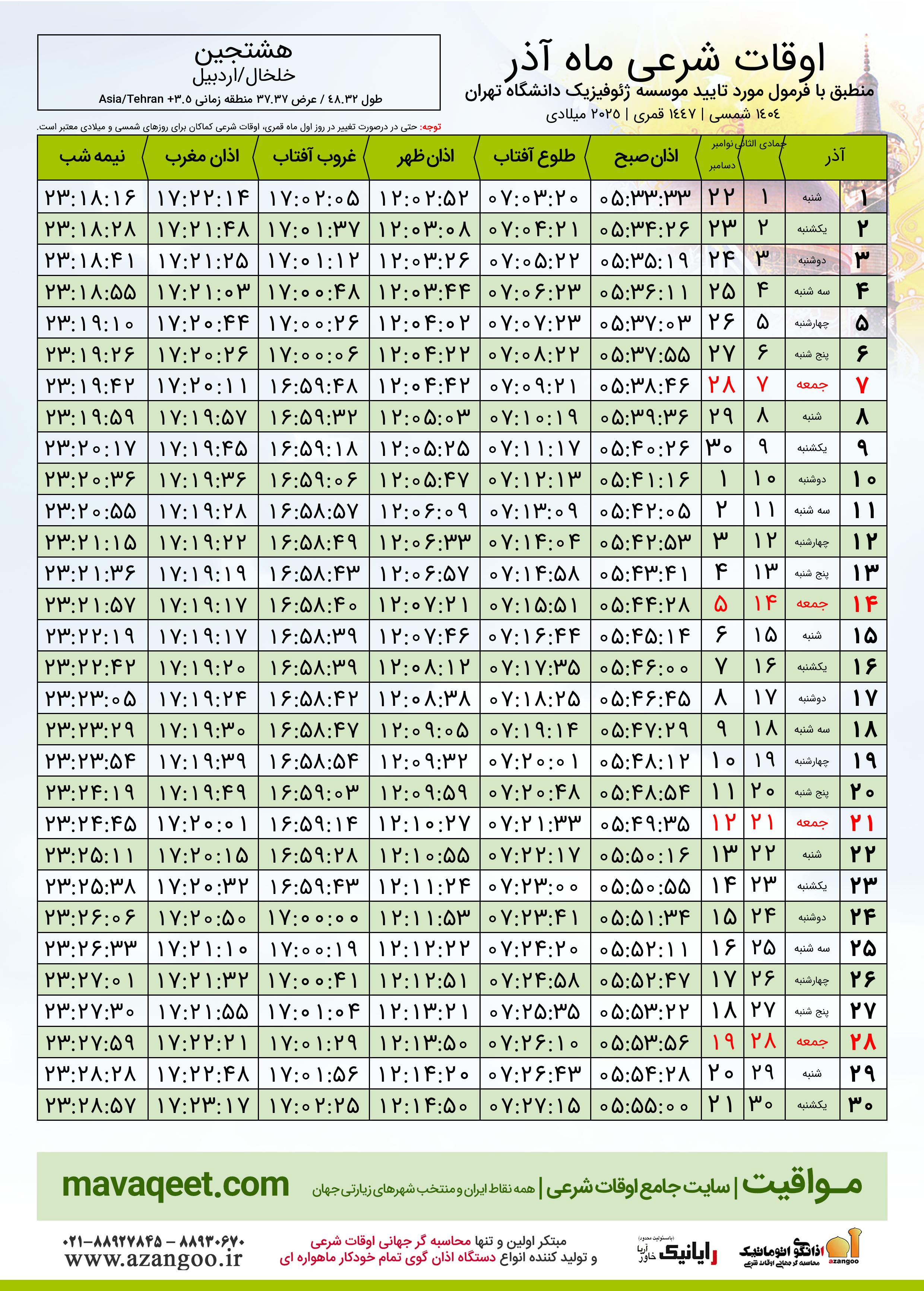 جدول اوقات شرعی آذر ١٤٠٤ شمسی شهر هشتجین