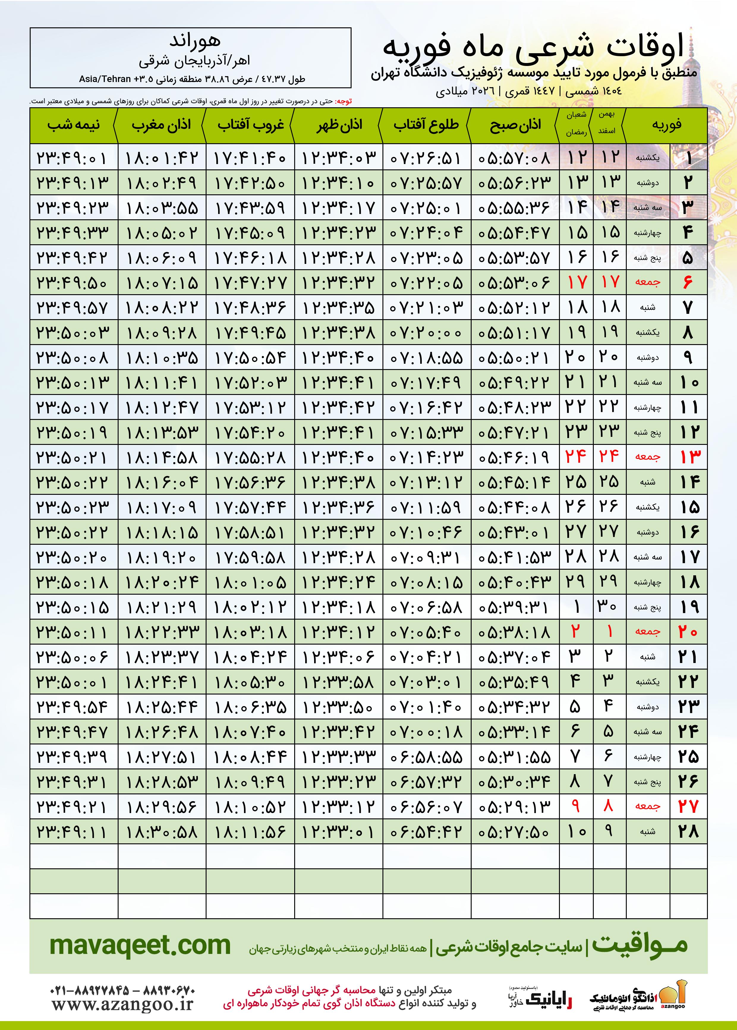اوقات شرعی ماه رمضان شهر هوراند ١٤٠٤ - ٠٤ شمسی | ٢٠٢٦ میلادی